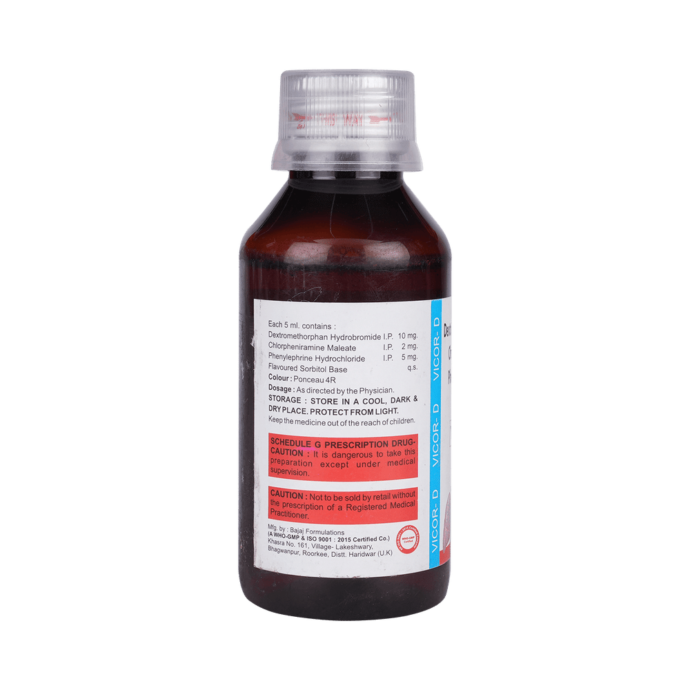 Vicor-D Syrup is a combination of three medicines: Phenylephrine, Chlorpheniramine Maleate, and Dextromethorphan Hydrobromide. Phenylephrine is a decongestant which narrows the small blood vessels providing relief from congestion or stuffiness in the nose. Chlorpheniramine Maleate is an antiallergic which relieves allergy symptoms like runny nose, watery eyes and sneezing. Dextromethorphan Hydrobromide is a cough suppressant which relieves cough by reducing the activity of cough center in the brain.