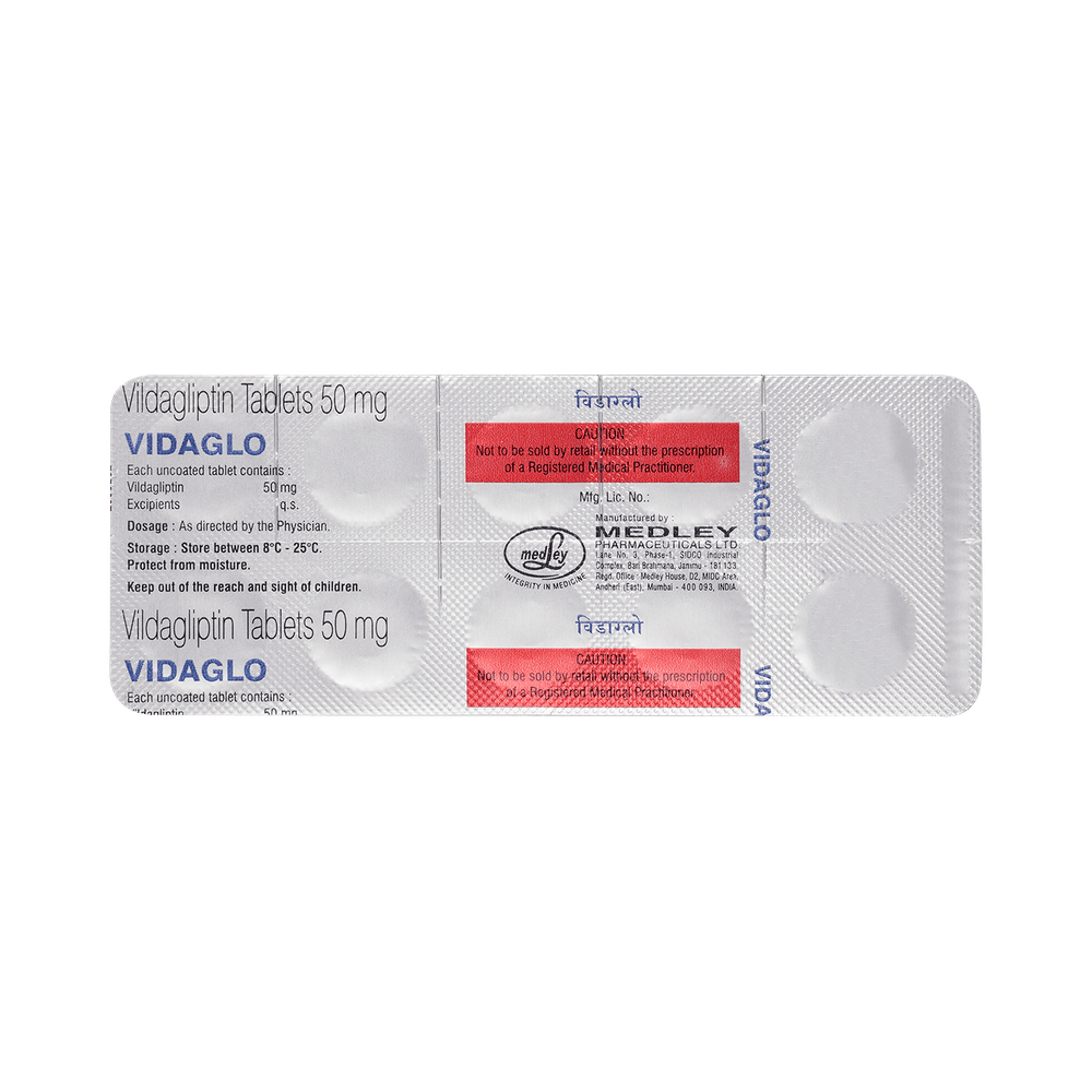 Vidaglo Tablet is a medicine used to treat type 2 diabetes mellitus. It is used together with a healthy diet and regular exercise to control blood sugar levels. This helps to prevent serious complications of diabetes like kidney damage and blindness. Vidaglo Tablet is normally prescribed when diet and exercise alone or other medicines do not prove sufficient to control your blood sugar level. It may prescribe alone or in combination with other diabetes medicines. It can be taken with or without food. The dose will depend on your condition and blood sugar levels. Use it strictly as advised by your doctor.You should take it regularly at the same time each day to get the most benefit. Do not stop taking the medicine unless advised by your doctor. It is important to stay on the diet and exercise program recommended by your doctor while taking this medicine. Your lifestyle plays a big part in controlling diabetes.The most common side effects of Vidaglo Tablet include hypoglycemia, tremor, headache, dizziness, fatigue, and nausea. It is important to recognize the symptoms of hypoglycemia (such as lightheadedness, sweating, dizziness, fainting, and dry mouth) and know how to deal with it. You can carry sugar or glucose candy and have them to control your symptoms if you experience any. Contact your doctor if the side effects do not go away or worry you.Before taking this medicine, let your doctor know if you have ever had kidney disease, heart disease, or pancreas problems. Pregnant or breastfeeding women should also consult their doctor before taking it. Some other medicines you are taking may interfere with this medicine's working. So, make sure your doctor knows about all the other medicines you are using. Limit your alcohol intake while taking this medicine because it can increase your risk of developing low blood sugar levels. You may need regular tests such as kidney function and blood glucose levels to check that the medicine is working properly.