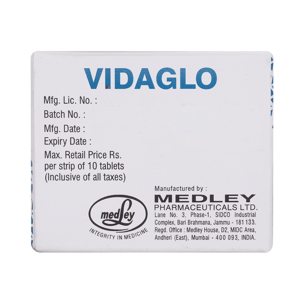 Vidaglo Tablet is an antidiabetic medication. It works by increasing the release of insulin from the pancreas and decreasing the hormones that raise blood sugar levels. This reduces the fasting and postmeal sugar levels.