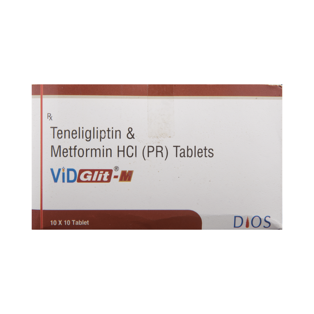 Vidglit-M Tablet PR is a combination of two medicines that control high blood sugar levels in people with type 2 diabetes mellitus. This helps prevent serious complications of diabetes such as kidney damage and blindness and may also reduce your chances of having a heart attack or stroke. Vidglit-M Tablet PR can be prescribed alone or together with other diabetes medications. All diabetes medicines work best when used along with a healthy diet and regular exercise. The dose you are given will depend on your condition, blood sugar levels, and what other medicines you are taking. Taking it with meals helps to reduce the chances of developing an upset stomach.You should take it regularly, at the same time each day, to get the most benefit and you should not stop unless your doctor recommends it. It is controlling your blood sugar levels and helping to prevent serious complications in the future. It is important to stay on the diet and exercise program recommended by your doctor while taking this medicine. Your lifestyle plays a big part in controlling diabetes.The most common side effects of taking this medicine include diarrhea, nausea, vomiting, upset stomach, and headache. Low blood sugar level (hypoglycemia) is a possible side effect if you are also taking other diabetes medicines like insulin or sulfonylurea, so you need to know how to recognize and deal with it.This medicine is not suitable for everyone. Before taking it, you should let your doctor know if you have ever had kidney, liver, or heart disease, problems with your pancreas, or if you drink a lot of alcohol. Pregnant or breastfeeding women should also consult their doctor before taking this medicine. Some other medicines can affect this one so tell your doctor about all the medicines you are taking to make sure you are safe. You should try to avoid drinking alcohol as it lowers blood glucose. Your doctor will check your kidney function and blood sugar levels before and during treatment.