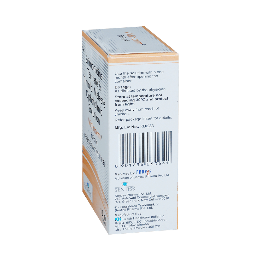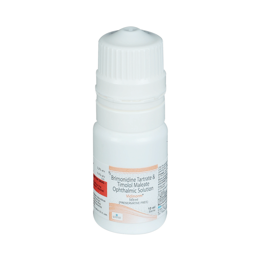 Vidinorm Ophthalmic Solution is a prescription medicine used for the treatment of pressure in the eyes (ocular hypertension) and glaucoma. It works by decreasing the pressure of fluid in the eye (aqueous humor), which helps in lowering the increased eye pressure. Vidinorm Ophthalmic Solution is to be used only in the affected eye in the dose and duration as advised by the doctor. Wash your hands before using this medicine. Check the label thoroughly for directions before use. Do not skip any doses and finish the full course of treatment even if you feel better.The most common side effects include burning, irritation, itching, and redness at the application site, sleepiness, and decreased alertness. If these side effects persist for a longer duration, inform your doctor. In case of accidental contact with your nose or mouth, immediately rinse it off with plenty of water. Do not drive or operate heavy machinery immediately after the use of this medicine as it may cause temporary blurring of vision and may affect your ability to drive.