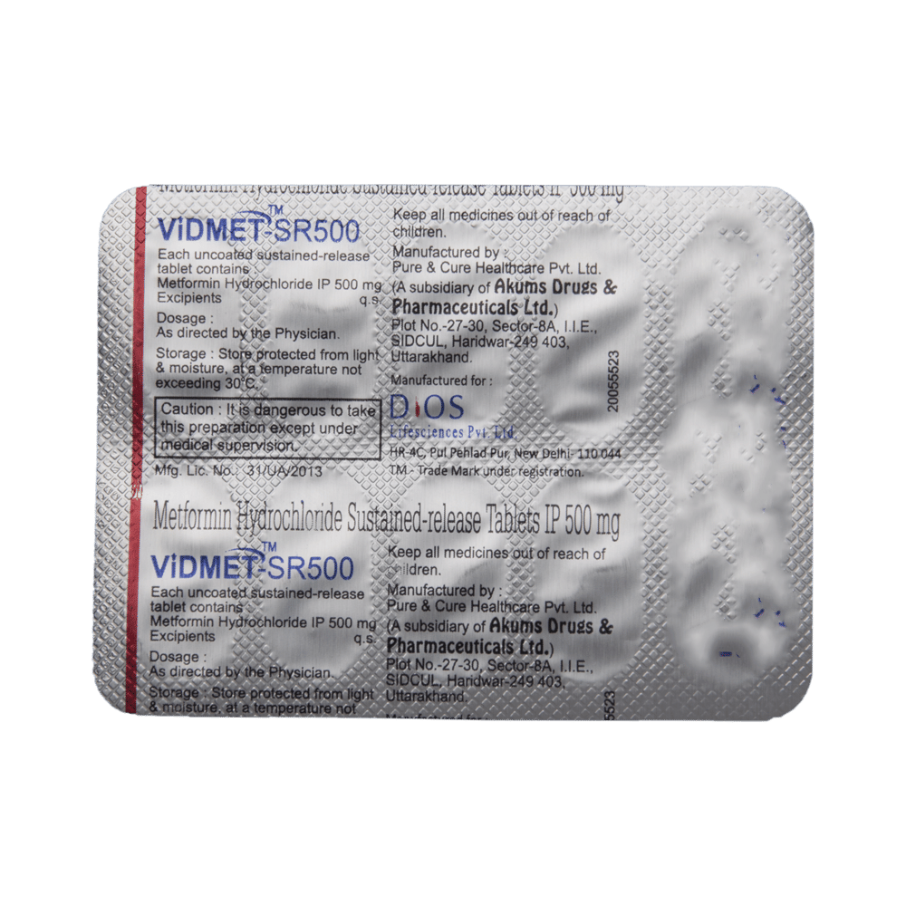 In Treatment of Type 2 diabetes mellitusLowering blood glucose levels is an essential part of managing diabetes. If you can control the level, you will reduce the risk of getting any of the serious complications of diabetes, such as kidney damage, eye damage, nerve problems, and loss of limbs. Taking Vidmet-SR 500 Tablet regularly, along with proper diet and exercise, will help you live a normal, healthy life.