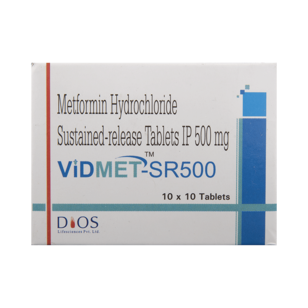 Vidmet-SR 500 Tablet is a medicine used to treat type 2 diabetes mellitus. It helps control blood sugar levels and thus prevents serious complications of diabetes. It is also used to treat a menstruation-related disorder known as polycystic ovary syndrome (PCOS) in women. Vidmet-SR 500 Tablet is best taken with food to avoid nausea and abdominal pain. You should take it regularly, at the same time each day, to get the most benefit. You should not stop taking this medicine unless your doctor recommends it. Your lifestyle plays a big part in controlling diabetes. Therefore, it is important to stay on the diet and exercise program recommended by your doctor while taking this medicine.The most common side effects of this medicine include diarrhea, nausea, vomiting, abdominal discomfort, headache, and loss of appetite. Some people may develop hypoglycemia (low blood sugar level) when this medicine is taken along with other antidiabetic medicines or alcohol or upon skipping a meal. Monitor your blood sugar levels regularly while taking it.Before taking this medicine, inform your doctor if you have any kidney, liver, or heart problems. Pregnant or breastfeeding women should also consult their doctor before taking it. Your doctor will check your kidney function before starting treatment with it. Avoid excessive alcohol intake while taking it, as this may increase the risk of developing some side effects.