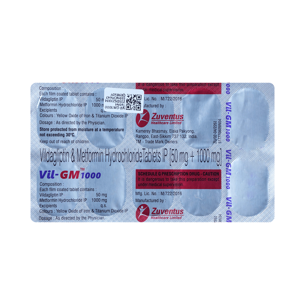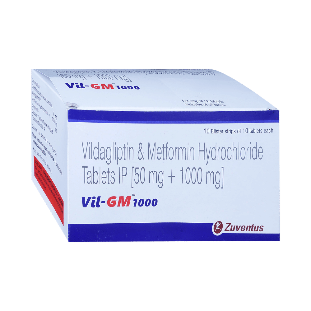 Vil-GM 1000 Tablet is a combination of two medicines that control high blood sugar levels in people with type 2 diabetes mellitus. This helps prevent serious complications of diabetes, such as kidney damage and blindness, and may also reduce your chances of having a heart attack or stroke. Vil-GM 1000 Tablet can be prescribed alone or together with other diabetes medications. All diabetes medicines work best when used along with a healthy diet and regular exercise. The dose you are given will depend on your condition, blood sugar levels, and what other medicines you are taking. Taking it with meals helps reduce the chances of developing an upset stomach. You should take it regularly, at the same time each day, to get the most benefit, and you should not stop unless your doctor recommends it. It controls your blood sugar levels and helps prevent serious complications in the future. It is important to stay on the diet and exercise program recommended by your doctor while taking this medicine. Your lifestyle plays a big part in controlling diabetes.The most common side effects of taking this medicine include nausea, headache, and gastroesophageal reflux disease. Low blood sugar level (hypoglycemia) is also a possible side effect if you are also taking other diabetes medicines like insulin or sulfonylurea, so you need to know how to recognize and deal with it.This medicine is not suitable for everyone. Before taking it, you should let your doctor know if you have ever had kidney, liver, or heart disease; problems with your pancreas; or if you drink a lot of alcohol. Pregnant or breastfeeding women should also consult their doctor before taking this medicine. Some other medicines can affect this one, so tell your doctor about all the medicines you are taking to make sure Vil-GM 1000 Tablet is safe. You should try to avoid drinking alcohol, as it lowers blood glucose. Your doctor will check your kidney function and blood sugar levels before and during treatment.