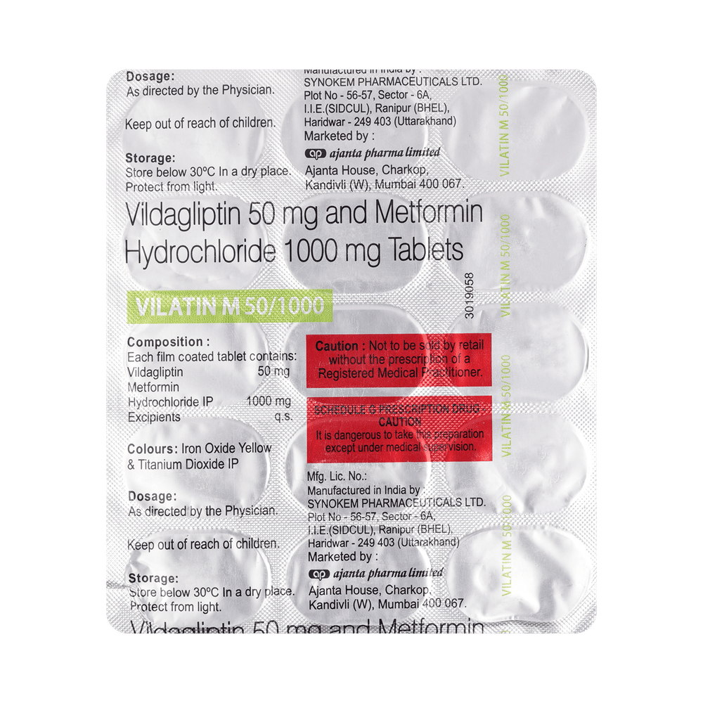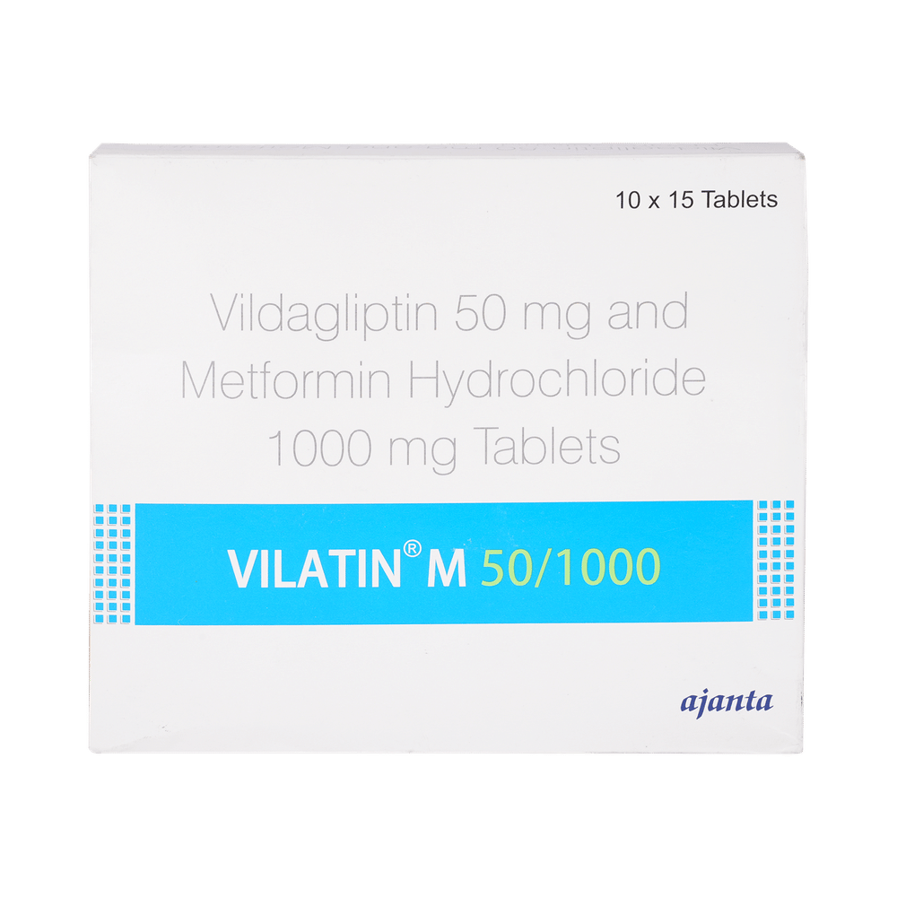 In Treatment of Type 2 diabetes mellitusVilatin M 1000mg/50mg Tablet is a combination of two medicines that work together in different ways to lower your blood glucose levels. Lowering blood glucose levels is an essential part of managing diabetes. If you can control your blood glucose level, your risk of getting any of the serious complications of diabetes such as kidney damage, eye damage, nerve problems, and loss of limbs is also lowered. Additionally, proper control of diabetes can also reduce the risk of heart disease and stroke. Taking this medicine regularly along with proper diet and exercise will help you live a normal, healthy life. You should keep using this medicine for as long as it is prescribed because it is protecting your future health.