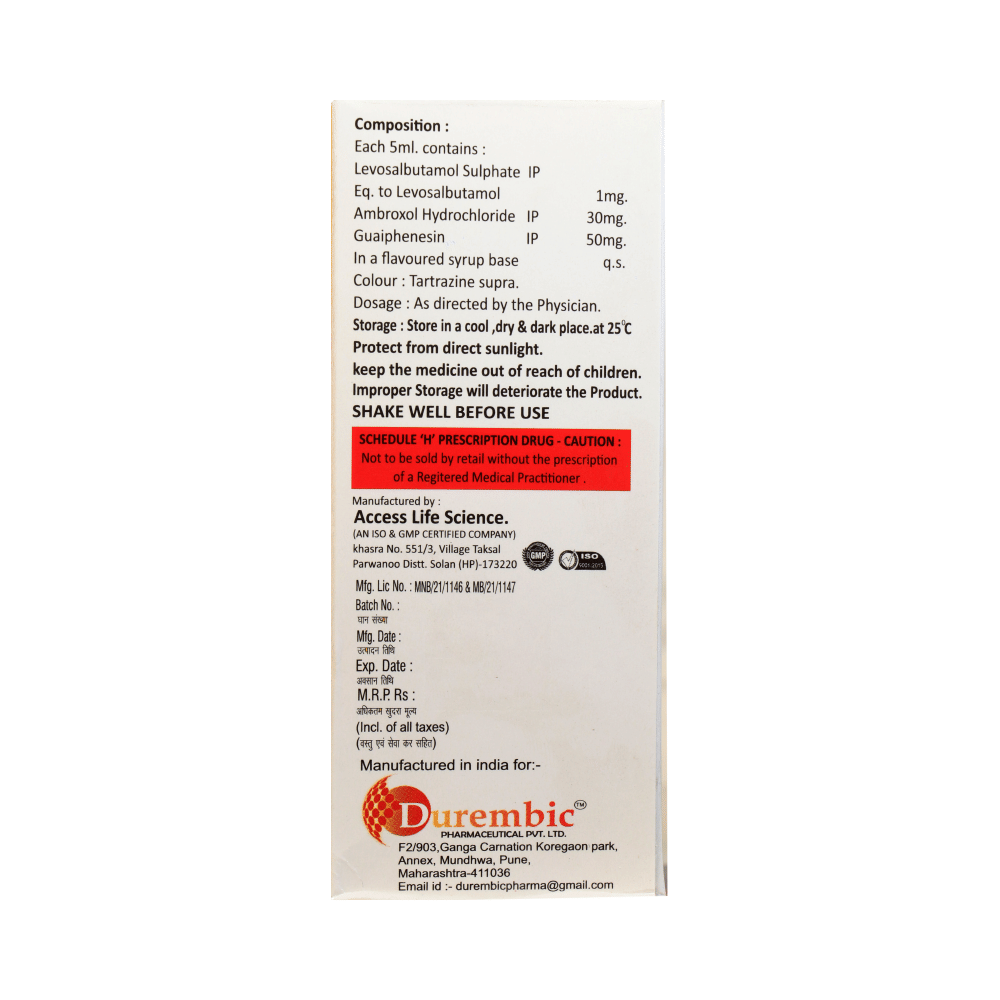 Salt Composition: Levosalbutamol (1mg/5ml) + Ambroxol (30mg/5ml) + Guaifenesin (50mg/5ml)
