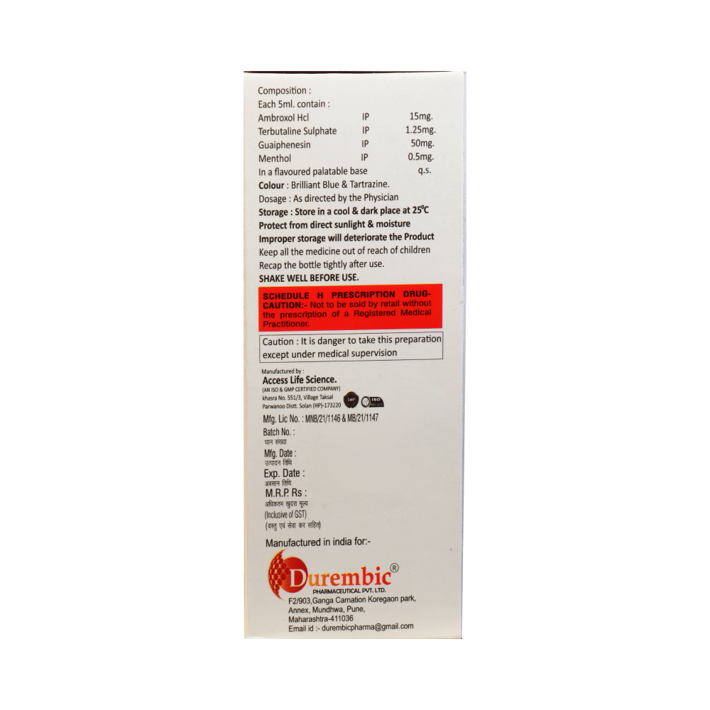 Salt Composition: Ambroxol (15mg/5ml) + Guaifenesin (50mg/5ml) + Menthol (0.5mg/5ml) + Terbutaline (1.25mg/5ml)