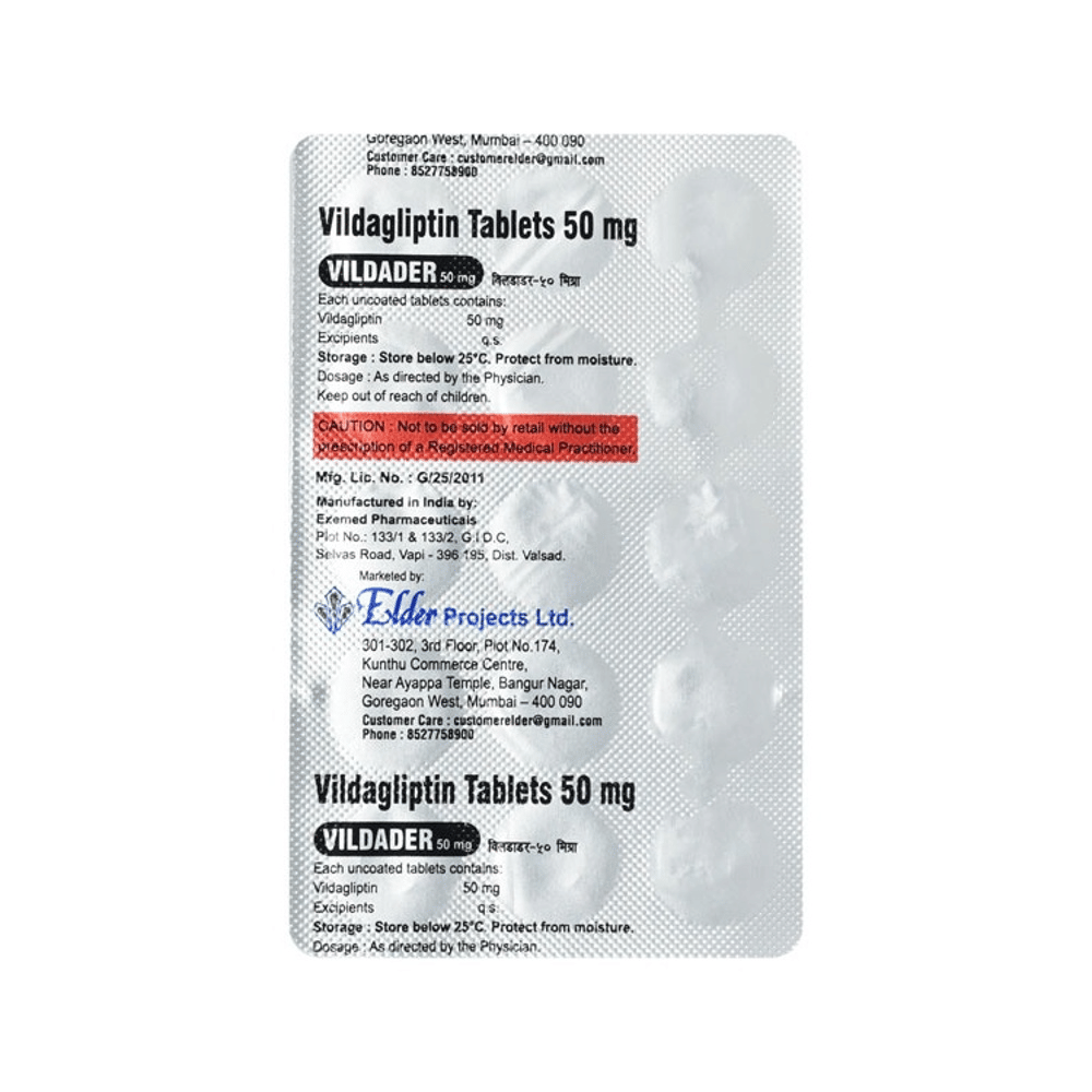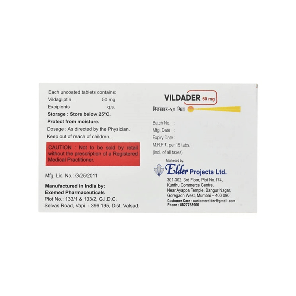 Vildader 50mg Tablet is a medicine used to treat type 2 diabetes mellitus. It is used together with a healthy diet and regular exercise to control blood sugar levels. This helps to prevent serious complications of diabetes like kidney damage and blindness. Vildader 50mg Tablet is normally prescribed when diet and exercise alone or other medicines do not prove sufficient to control your blood sugar level. It may prescribe alone or in combination with other diabetes medicines. It can be taken with or without food. The dose will depend on your condition and blood sugar levels. Use it strictly as advised by your doctor.You should take it regularly at the same time each day to get the most benefit. Do not stop taking the medicine unless advised by your doctor. It is important to stay on the diet and exercise program recommended by your doctor while taking this medicine. Your lifestyle plays a big part in controlling diabetes.The most common side effects of Vildader 50mg Tablet include hypoglycemia, tremor, headache, dizziness, fatigue, and nausea. It is important to recognize the symptoms of hypoglycemia (such as lightheadedness, sweating, dizziness, fainting, and dry mouth) and know how to deal with it. You can carry sugar or glucose candy and have them to control your symptoms if you experience any. Contact your doctor if the side effects do not go away or worry you.Before taking this medicine, let your doctor know if you have ever had kidney disease, heart disease, or pancreas problems. Pregnant or breastfeeding women should also consult their doctor before taking it. Some other medicines you are taking may interfere with this medicine's working. So, make sure your doctor knows about all the other medicines you are using. Limit your alcohol intake while taking this medicine because it can increase your risk of developing low blood sugar levels. You may need regular tests such as kidney function and blood glucose levels to check that the medicine is working properly.