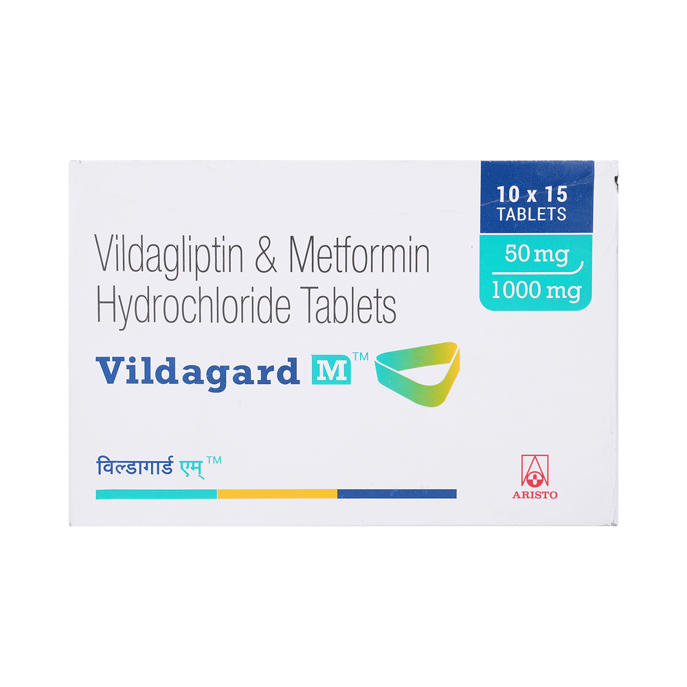 In Treatment of Type 2 diabetes mellitusVildagard M 1000mg/50mg Tablet is a combination of two medicines that work together in different ways to lower your blood glucose levels. Lowering blood glucose levels is an essential part of managing diabetes. If you can control your blood glucose level, your risk of getting any of the serious complications of diabetes such as kidney damage, eye damage, nerve problems, and loss of limbs is also lowered. Additionally, proper control of diabetes can also reduce the risk of heart disease and stroke. Taking this medicine regularly along with proper diet and exercise will help you live a normal, healthy life. You should keep using this medicine for as long as it is prescribed because it is protecting your future health.