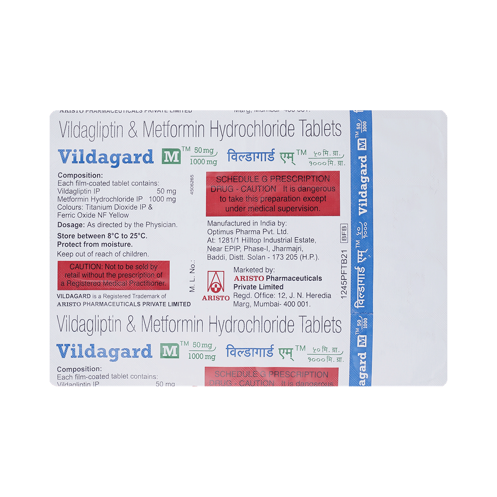 Vildagard M 1000mg/50mg Tablet is a combination of two antidiabetic medicines: metformin and vildagliptin. Metformin is an anti-diabetic medication (biguanide). It works by lowering glucose production in the liver, delaying glucose absorption from the intestines, and increasing the body's sensitivity to insulin. Vildagliptin is a DPP-4 inhibitor that works by increasing the release of insulin from the pancreas and decreasing the hormones that raise blood sugar levels. This reduces both fasting and post-meal sugar levels. Together, they provide better control of blood sugar.