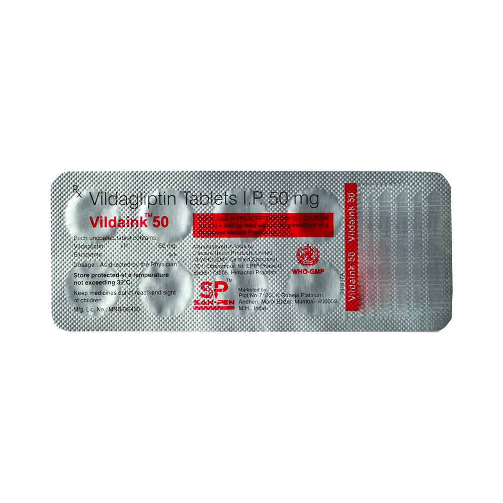 Vildaink 50 Tablet is a medicine used to treat type 2 diabetes mellitus. It is used together with a healthy diet and regular exercise to control blood sugar levels. This helps to prevent serious complications of diabetes like kidney damage and blindness. Vildaink 50 Tablet is normally prescribed when diet and exercise alone or other medicines do not prove sufficient to control your blood sugar level. It may prescribe alone or in combination with other diabetes medicines. It can be taken with or without food. The dose will depend on your condition and blood sugar levels. Use it strictly as advised by your doctor.You should take it regularly at the same time each day to get the most benefit. Do not stop taking the medicine unless advised by your doctor. It is important to stay on the diet and exercise program recommended by your doctor while taking this medicine. Your lifestyle plays a big part in controlling diabetes.The most common side effects of Vildaink 50 Tablet include hypoglycemia, tremor, headache, dizziness, fatigue, and nausea. It is important to recognize the symptoms of hypoglycemia (such as lightheadedness, sweating, dizziness, fainting, and dry mouth) and know how to deal with it. You can carry sugar or glucose candy and have them to control your symptoms if you experience any. Contact your doctor if the side effects do not go away or worry you.Before taking this medicine, let your doctor know if you have ever had kidney disease, heart disease, or pancreas problems. Pregnant or breastfeeding women should also consult their doctor before taking it. Some other medicines you are taking may interfere with this medicine's working. So, make sure your doctor knows about all the other medicines you are using. Limit your alcohol intake while taking this medicine because it can increase your risk of developing low blood sugar levels. You may need regular tests such as kidney function and blood glucose levels to check that the medicine is working properly.