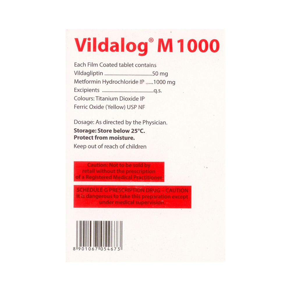 Vildalog M 1000mg/50mg Tablet is a combination of two medicines that control high blood sugar levels in people with type 2 diabetes mellitus. This helps prevent serious complications of diabetes, such as kidney damage and blindness, and may also reduce your chances of having a heart attack or stroke. Vildalog M 1000mg/50mg Tablet can be prescribed alone or together with other diabetes medications. All diabetes medicines work best when used along with a healthy diet and regular exercise. The dose you are given will depend on your condition, blood sugar levels, and what other medicines you are taking. Taking it with meals helps reduce the chances of developing an upset stomach. You should take it regularly, at the same time each day, to get the most benefit, and you should not stop unless your doctor recommends it. It controls your blood sugar levels and helps prevent serious complications in the future. It is important to stay on the diet and exercise program recommended by your doctor while taking this medicine. Your lifestyle plays a big part in controlling diabetes.The most common side effects of taking this medicine include nausea, headache, and gastroesophageal reflux disease. Low blood sugar level (hypoglycemia) is also a possible side effect if you are also taking other diabetes medicines like insulin or sulfonylurea, so you need to know how to recognize and deal with it.This medicine is not suitable for everyone. Before taking it, you should let your doctor know if you have ever had kidney, liver, or heart disease; problems with your pancreas; or if you drink a lot of alcohol. Pregnant or breastfeeding women should also consult their doctor before taking this medicine. Some other medicines can affect this one, so tell your doctor about all the medicines you are taking to make sure Vildalog M 1000mg/50mg Tablet is safe. You should try to avoid drinking alcohol, as it lowers blood glucose. Your doctor will check your kidney function and blood sugar levels before and during treatment.