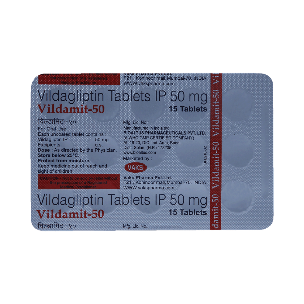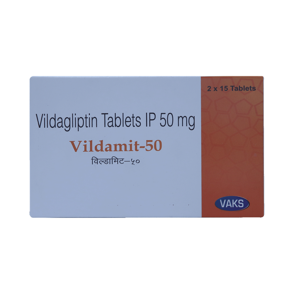 Vildamit 50mg Tablet is a medicine used to treat type 2 diabetes mellitus. It is used together with a healthy diet and regular exercise to control blood sugar levels. This helps to prevent serious complications of diabetes like kidney damage and blindness. Vildamit 50mg Tablet is normally prescribed when diet and exercise alone or other medicines do not prove sufficient to control your blood sugar level. It may prescribe alone or in combination with other diabetes medicines. It can be taken with or without food. The dose will depend on your condition and blood sugar levels. Use it strictly as advised by your doctor.You should take it regularly at the same time each day to get the most benefit. Do not stop taking the medicine unless advised by your doctor. It is important to stay on the diet and exercise program recommended by your doctor while taking this medicine. Your lifestyle plays a big part in controlling diabetes.The most common side effects of Vildamit 50mg Tablet include hypoglycemia, tremor, headache, dizziness, fatigue, and nausea. It is important to recognize the symptoms of hypoglycemia (such as lightheadedness, sweating, dizziness, fainting, and dry mouth) and know how to deal with it. You can carry sugar or glucose candy and have them to control your symptoms if you experience any. Contact your doctor if the side effects do not go away or worry you.Before taking this medicine, let your doctor know if you have ever had kidney disease, heart disease, or pancreas problems. Pregnant or breastfeeding women should also consult their doctor before taking it. Some other medicines you are taking may interfere with this medicine's working. So, make sure your doctor knows about all the other medicines you are using. Limit your alcohol intake while taking this medicine because it can increase your risk of developing low blood sugar levels. You may need regular tests such as kidney function and blood glucose levels to check that the medicine is working properly.