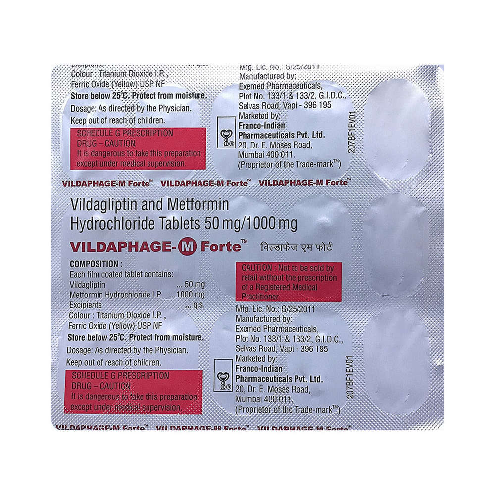 In Treatment of Type 2 diabetes mellitusVildaphage-M Forte Tablet is a combination of two medicines that work together in different ways to lower your blood glucose levels. Lowering blood glucose levels is an essential part of managing diabetes. If you can control your blood glucose level, your risk of getting any of the serious complications of diabetes such as kidney damage, eye damage, nerve problems, and loss of limbs is also lowered. Additionally, proper control of diabetes can also reduce the risk of heart disease and stroke. Taking this medicine regularly along with proper diet and exercise will help you live a normal, healthy life. You should keep using this medicine for as long as it is prescribed because it is protecting your future health.