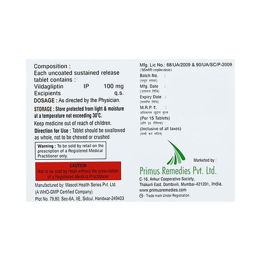 Vildaprime 100mg Tablet SR is a medicine used to treat type 2 diabetes mellitus. It is used together with a healthy diet and regular exercise to control blood sugar levels. This helps to prevent serious complications of diabetes like kidney damage and blindness. Vildaprime 100mg Tablet SR is normally prescribed when diet and exercise alone or other medicines do not prove sufficient to control your blood sugar level. It may prescribe alone or in combination with other diabetes medicines. It can be taken with or without food. The dose will depend on your condition and blood sugar levels. Use it strictly as advised by your doctor.You should take it regularly at the same time each day to get the most benefit. Do not stop taking the medicine unless advised by your doctor. It is important to stay on the diet and exercise program recommended by your doctor while taking this medicine. Your lifestyle plays a big part in controlling diabetes.The most common side effects of Vildaprime 100mg Tablet SR include hypoglycemia, tremor, headache, dizziness, fatigue, and nausea. It is important to recognize the symptoms of hypoglycemia (such as lightheadedness, sweating, dizziness, fainting, and dry mouth) and know how to deal with it. You can carry sugar or glucose candy and have them to control your symptoms if you experience any. Contact your doctor if the side effects do not go away or worry you.Before taking this medicine, let your doctor know if you have ever had kidney disease, heart disease, or pancreas problems. Pregnant or breastfeeding women should also consult their doctor before taking it. Some other medicines you are taking may interfere with this medicine's working. So, make sure your doctor knows about all the other medicines you are using. Limit your alcohol intake while taking this medicine because it can increase your risk of developing low blood sugar levels. You may need regular tests such as kidney function and blood glucose levels to check that the medicine is working properly.