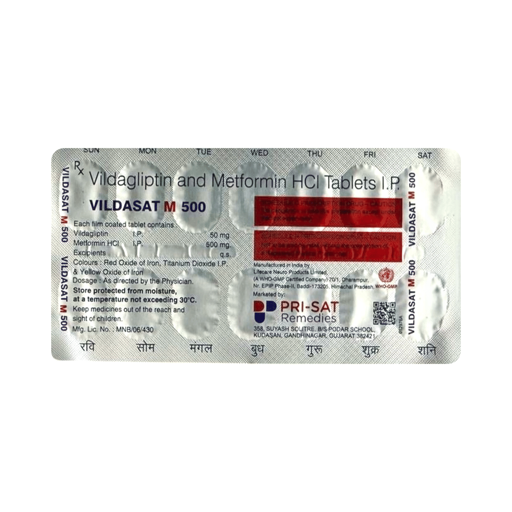 Vildasat M 500 Tablet is a combination of two antidiabetic medicines: metformin and vildagliptin. Metformin is an anti-diabetic medication (biguanide). It works by lowering glucose production in the liver, delaying glucose absorption from the intestines, and increasing the body's sensitivity to insulin. Vildagliptin is a DPP-4 inhibitor that works by increasing the release of insulin from the pancreas and decreasing the hormones that raise blood sugar levels. This reduces both fasting and post-meal sugar levels. Together, they provide better control of blood sugar.