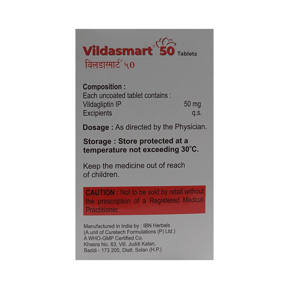 Vildasmart 50 Tablet is a medicine used to treat type 2 diabetes mellitus. It is used together with a healthy diet and regular exercise to control blood sugar levels. This helps to prevent serious complications of diabetes like kidney damage and blindness. Vildasmart 50 Tablet is normally prescribed when diet and exercise alone or other medicines do not prove sufficient to control your blood sugar level. It may prescribe alone or in combination with other diabetes medicines. It can be taken with or without food. The dose will depend on your condition and blood sugar levels. Use it strictly as advised by your doctor.You should take it regularly at the same time each day to get the most benefit. Do not stop taking the medicine unless advised by your doctor. It is important to stay on the diet and exercise program recommended by your doctor while taking this medicine. Your lifestyle plays a big part in controlling diabetes.The most common side effects of Vildasmart 50 Tablet include hypoglycemia, tremor, headache, dizziness, fatigue, and nausea. It is important to recognize the symptoms of hypoglycemia (such as lightheadedness, sweating, dizziness, fainting, and dry mouth) and know how to deal with it. You can carry sugar or glucose candy and have them to control your symptoms if you experience any. Contact your doctor if the side effects do not go away or worry you.Before taking this medicine, let your doctor know if you have ever had kidney disease, heart disease, or pancreas problems. Pregnant or breastfeeding women should also consult their doctor before taking it. Some other medicines you are taking may interfere with this medicine's working. So, make sure your doctor knows about all the other medicines you are using. Limit your alcohol intake while taking this medicine because it can increase your risk of developing low blood sugar levels. You may need regular tests such as kidney function and blood glucose levels to check that the medicine is working properly.