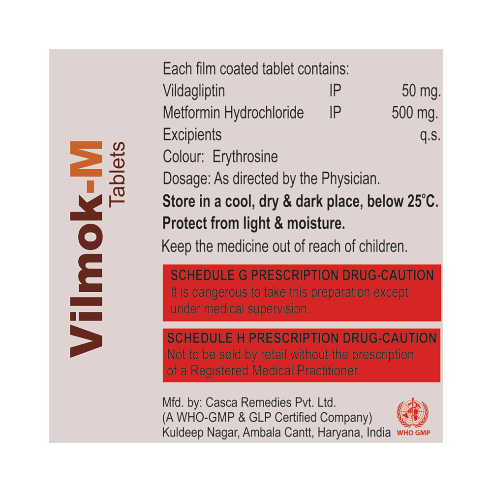 Vilmok-M Tablet is a combination of two antidiabetic medicines: metformin and vildagliptin. Metformin is an anti-diabetic medication (biguanide). It works by lowering glucose production in the liver, delaying glucose absorption from the intestines, and increasing the body's sensitivity to insulin. Vildagliptin is a DPP-4 inhibitor that works by increasing the release of insulin from the pancreas and decreasing the hormones that raise blood sugar levels. This reduces both fasting and post-meal sugar levels. Together, they provide better control of blood sugar.