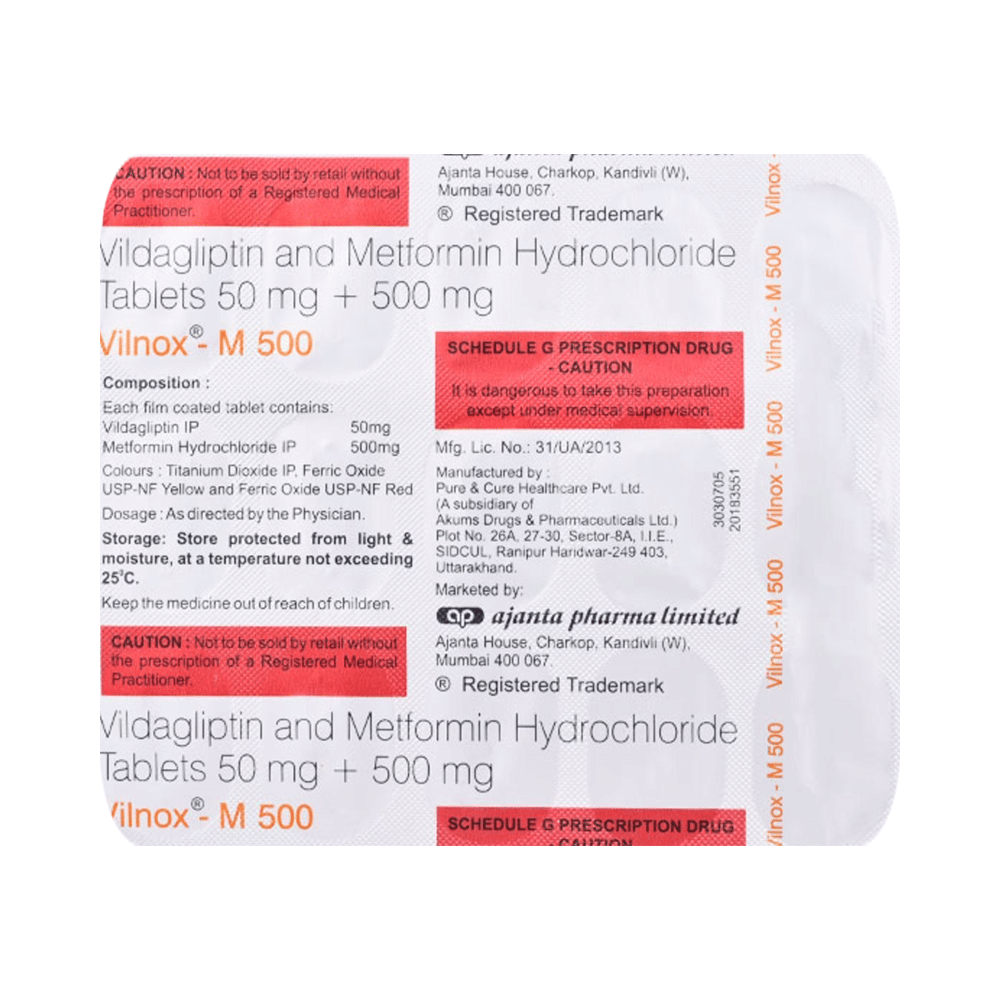 In Treatment of Type 2 diabetes mellitusVilnox-M 500 Tablet is a combination of two medicines that work together in different ways to lower your blood glucose levels. Lowering blood glucose levels is an essential part of managing diabetes. If you can control your blood glucose level, your risk of getting any of the serious complications of diabetes such as kidney damage, eye damage, nerve problems, and loss of limbs is also lowered. Additionally, proper control of diabetes can also reduce the risk of heart disease and stroke. Taking this medicine regularly along with proper diet and exercise will help you live a normal, healthy life. You should keep using this medicine for as long as it is prescribed because it is protecting your future health.