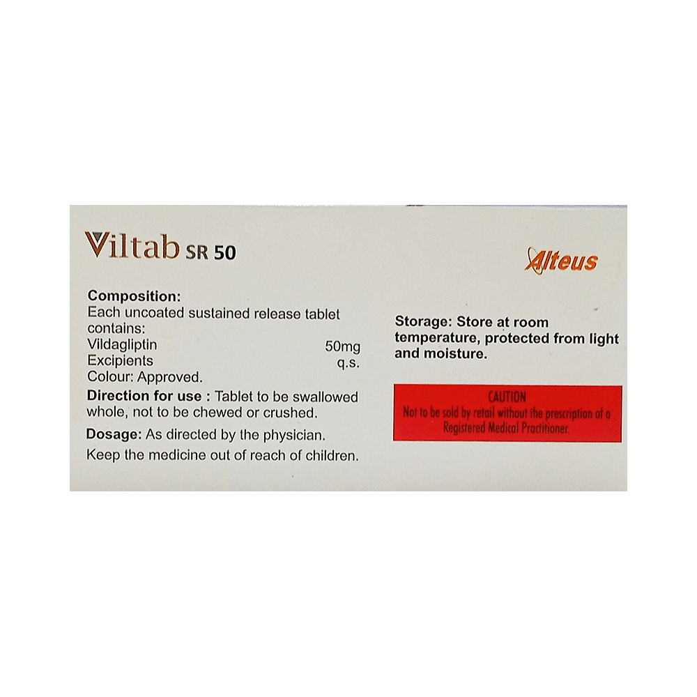 Viltab SR 50 Tablet is a medicine used to treat type 2 diabetes mellitus. It is used together with a healthy diet and regular exercise to control blood sugar levels. This helps to prevent serious complications of diabetes like kidney damage and blindness. Viltab SR 50 Tablet is normally prescribed when diet and exercise alone or other medicines do not prove sufficient to control your blood sugar level. It may prescribe alone or in combination with other diabetes medicines. It can be taken with or without food. The dose will depend on your condition and blood sugar levels. Use it strictly as advised by your doctor.You should take it regularly at the same time each day to get the most benefit. Do not stop taking the medicine unless advised by your doctor. It is important to stay on the diet and exercise program recommended by your doctor while taking this medicine. Your lifestyle plays a big part in controlling diabetes.The most common side effects of Viltab SR 50 Tablet include hypoglycemia, tremor, headache, dizziness, fatigue, and nausea. It is important to recognize the symptoms of hypoglycemia (such as lightheadedness, sweating, dizziness, fainting, and dry mouth) and know how to deal with it. You can carry sugar or glucose candy and have them to control your symptoms if you experience any. Contact your doctor if the side effects do not go away or worry you.Before taking this medicine, let your doctor know if you have ever had kidney disease, heart disease, or pancreas problems. Pregnant or breastfeeding women should also consult their doctor before taking it. Some other medicines you are taking may interfere with this medicine's working. So, make sure your doctor knows about all the other medicines you are using. Limit your alcohol intake while taking this medicine because it can increase your risk of developing low blood sugar levels. You may need regular tests such as kidney function and blood glucose levels to check that the medicine is working properly.