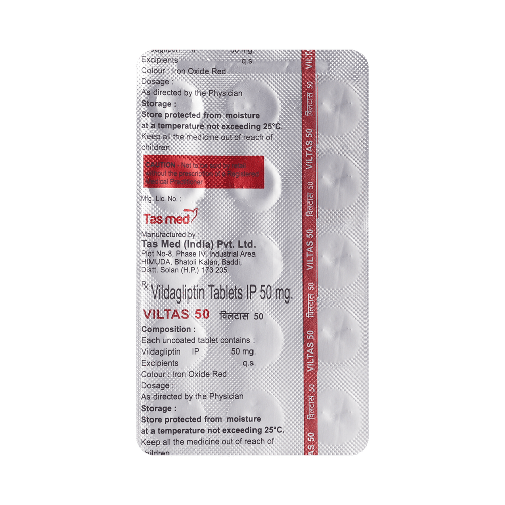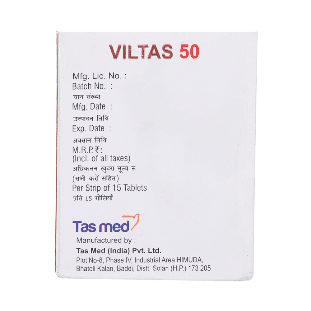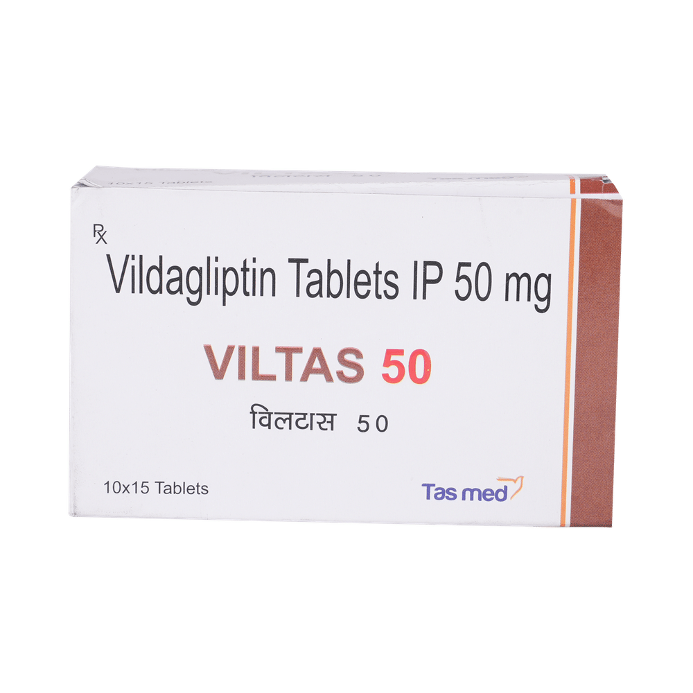 Viltas 50mg Tablet is a medicine used to treat type 2 diabetes mellitus. It is used together with a healthy diet and regular exercise to control blood sugar levels. This helps to prevent serious complications of diabetes like kidney damage and blindness. Viltas 50mg Tablet is normally prescribed when diet and exercise alone or other medicines do not prove sufficient to control your blood sugar level. It may prescribe alone or in combination with other diabetes medicines. It can be taken with or without food. The dose will depend on your condition and blood sugar levels. Use it strictly as advised by your doctor.You should take it regularly at the same time each day to get the most benefit. Do not stop taking the medicine unless advised by your doctor. It is important to stay on the diet and exercise program recommended by your doctor while taking this medicine. Your lifestyle plays a big part in controlling diabetes.The most common side effects of Viltas 50mg Tablet include hypoglycemia, tremor, headache, dizziness, fatigue, and nausea. It is important to recognize the symptoms of hypoglycemia (such as lightheadedness, sweating, dizziness, fainting, and dry mouth) and know how to deal with it. You can carry sugar or glucose candy and have them to control your symptoms if you experience any. Contact your doctor if the side effects do not go away or worry you.Before taking this medicine, let your doctor know if you have ever had kidney disease, heart disease, or pancreas problems. Pregnant or breastfeeding women should also consult their doctor before taking it. Some other medicines you are taking may interfere with this medicine's working. So, make sure your doctor knows about all the other medicines you are using. Limit your alcohol intake while taking this medicine because it can increase your risk of developing low blood sugar levels. You may need regular tests such as kidney function and blood glucose levels to check that the medicine is working properly.