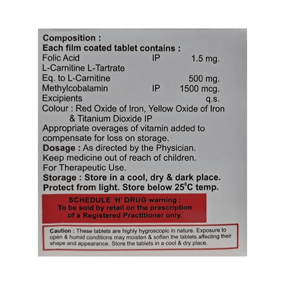 Salt Composition: Folic Acid (1.5mg) + L-Carnitine L-Tartrate (1500mcg) + Methylcobalamin (500mg)