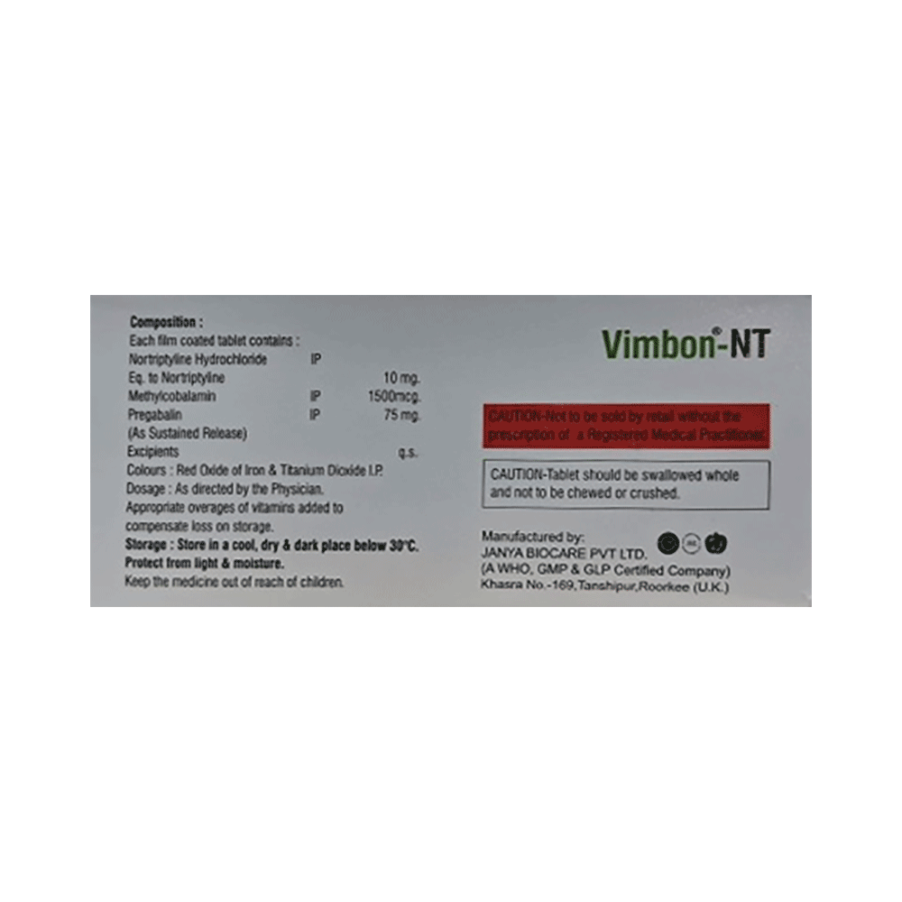 Vimbon-NT Tablet SR is a combination of three medicines: Pregabalin, Nortriptyline and Methylcobalamin. Pregabalin is an alpha 2 delta ligand which decreases pain by modulating calcium channel activity of the nerve cells. Nortriptyline is a tricyclic antidepressant which increases the levels of chemical messengers (serotonin and noradrenaline) that stop the movement of pain signals in the brain. Methylcobalamin is a form of vitamin B which helps in the production of myelin, a substance that protects nerve fibers and rejuvenates damaged nerve cells. Together, they relieve neuropathic pain (pain from damaged nerves).