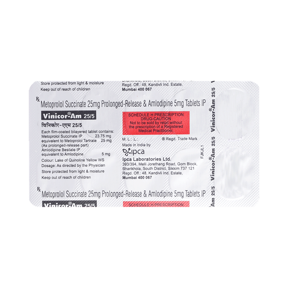 Vinicor-AM 25/5 Tablet Tablet PR contains two medicines, both of which help to control high blood pressure and heart rate. It is also used for heart-related chest pain (angina), abnormal heart rhythms and chronic (long-term) heart failure. You can take Vinicor-AM 25/5 Tablet Tablet PR at any time of day, with or without food, but it is best to take it at the same time each day. Keep taking it for as long as advised by your doctor. Even if you feel well, do not stop this medicine on your own because high blood pressure often has no symptoms. If you stop taking it, your condition may get worse. Keeping active with regular exercise, reducing your weight and eating a healthy diet will also help control your blood pressure. Follow your doctor’s advice while taking this medicine.It may cause side effects like headache, ankle swelling, skin rash, slow heart rate, nausea,a nd depression. It may also cause dizziness, so do not drive or do anything that requires mental focus until you know how this medicine affects you. This might raise the level of potassium in the blood, hence avoid potassium rich food or supplements. You may be asked for regular monitoring of blood pressure, kidney function, and electrolytes level while on the treatment.Before taking it, let your doctor know if you have any liver or kidney problems. Pregnant or breastfeeding women should also consult their doctor for advice before taking this medicine. You also need to tell your doctor what other medicines you are taking especially those used to treat high blood pressure or heart conditions.
