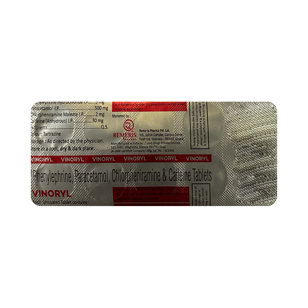 Vinoryl Tablet is a combination of four medicines: Caffeine, Chlorpheniramine Maleate, Paracetamol, and Phenylephrine, which relieves common cold symptoms.