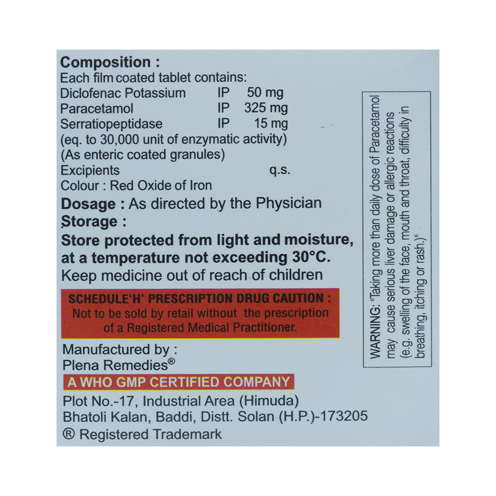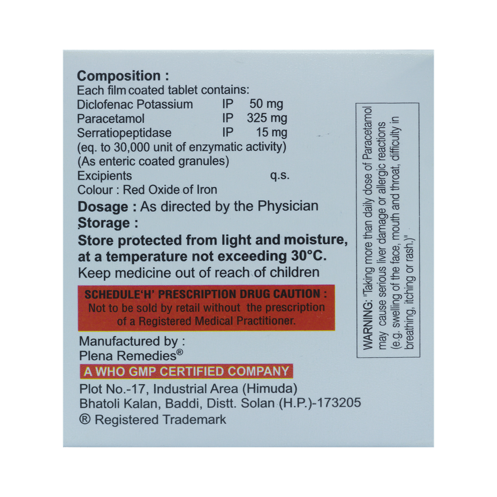 Salt Composition: Diclofenac (50mg) + Paracetamol (325mg) + Serratiopeptidase (15mg)