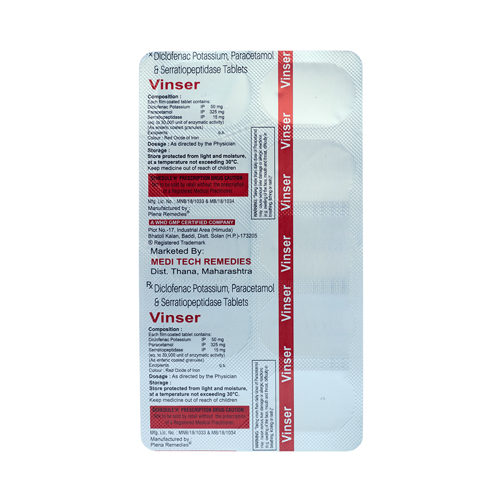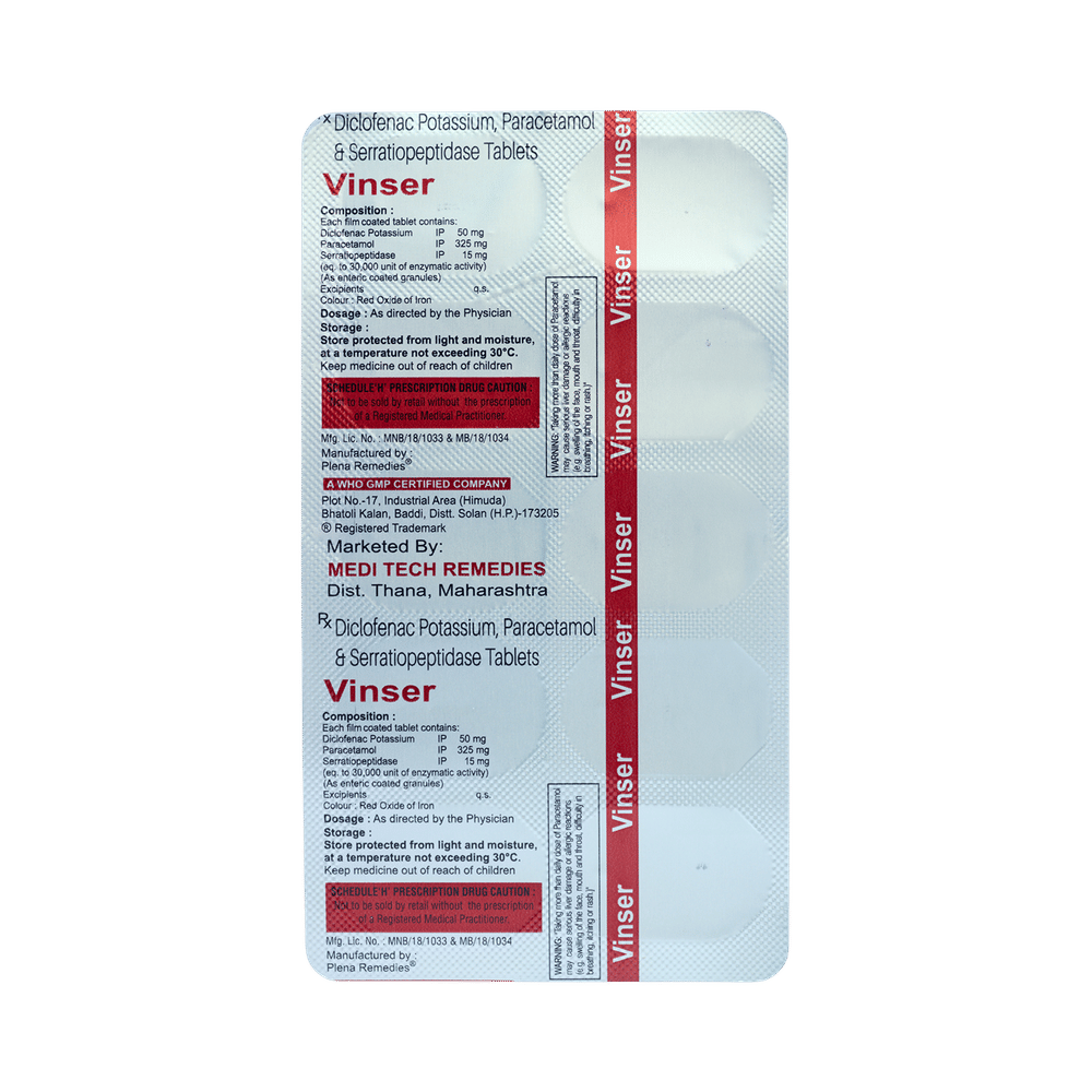 Vinser Tablet is a combination of three medicines: Diclofenac, Paracetamol and Serratiopeptidase, which relieves pain. Diclofenac is a non-steroidal anti-inflammatory drug (NSAID) and Paracetamol is an antipyretic (fever reducer). They work by blocking the release of certain chemical messengers in the brain that cause pain and fever. Serratiopeptidase is an enzyme which works by breaking down abnormal proteins at the site of inflammation, and promotes healing.