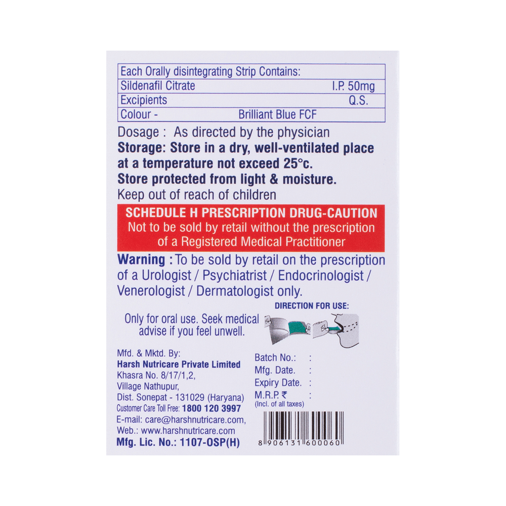 Virgola 50mg Disintegrating Strip is a prescription medicine used to treat erectile dysfunction (impotence) in men. It works by increasing blood flow to the penis. This helps men to get or maintain an erection. It belongs to a group of medicines known as phosphodiesterase type 5 (PDE 5) inhibitors. Virgola 50mg Disintegrating Strip may be taken on an empty stomach or with a meal. It should be strictly taken as advised by your doctor. You should take about 1 hour before you plan to have sex. The amount of time it takes to work varies from person to person, but it normally takes between 30 minutes and 1 hour. This medicine will only help you to get an erection if you are sexually stimulated. However, you should not take this medicine if you do not have erectile dysfunction. It should not be taken more than once a day.The most common side effects of this medicine are flushing (sense of warmth), headache, dizziness, blurred vision, muscle pain, stomach upset, and rash. Talk to your doctor if any of the side effects bother you or do not go away. They may be able to help by changing the dosage or prescribing you an alternate medicine.Virgola 50mg Disintegrating Strip is not intended for use by women and men should avoid using any other medicines to treat impotence without talking to a doctor first. It can be dangerous to take it along with medicines called nitrates (often given for chest pain or angina). Do not take this medicine if you have severe heart or liver problems, have recently had a stroke or heart attack or if you have low blood pressure. Let your doctor know if you suffer from these or any other health problems before taking it. You should not drive if this medicine makes you feel dizzy. Avoid drinking alcohol while taking this medicine as it increases the chances of side effects.