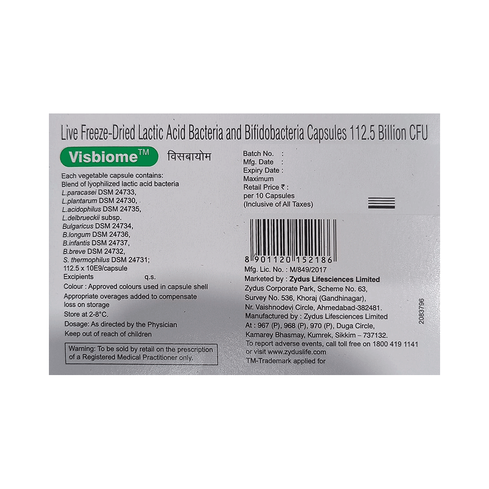 In Treatment of Irritable bowel syndromeIrritable bowel syndrome is a chronic (long-term) inflammatory disease of the large intestine (colon) that usually needs long term management. This can lead to bleeding, frequent diarrhea and abdominal pain. Visbiome Capsule can relieve these symptoms effectively. Continue taking Visbiome Capsule for as long as the doctor may advise you to. You need to take this medicine regularly to get the most out of it and you should drink plenty of fluids while taking it to make sure you stay hydrated.In Treatment of Ulcerative colitisUlcerative colitis is a disease of the large intestine (colon) and rectum in which the lining of the bowel becomes red and swollen. This can lead to bleeding, frequent diarrhea and abdominal pain. Visbiome Capsule contains beneficial bacteria that protect the inner layers of your stomach and intestines. It relieves these symptoms and also helps you to stay well by preventing them from coming back. You need to take this medicine regularly to get the most out of it and you should drink plenty of fluids while taking it to make sure you stay hydrated.show moreshow less
