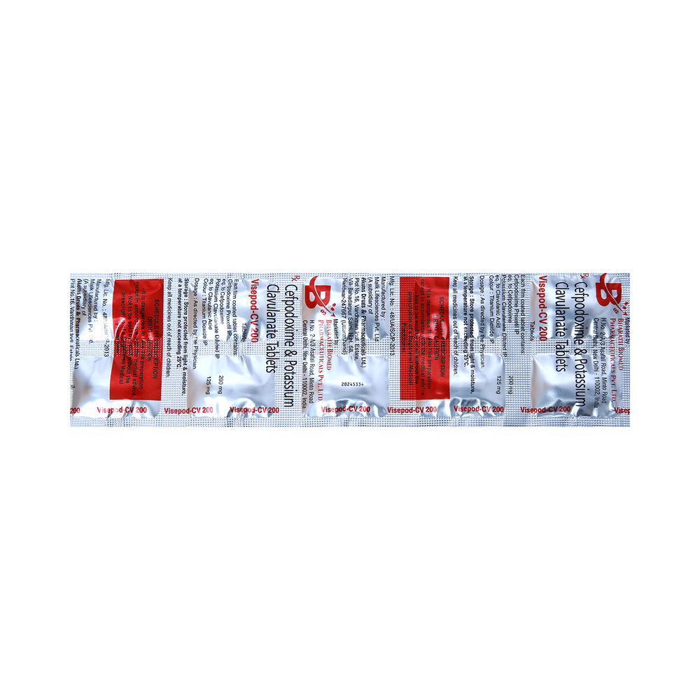 Visepod-CV 200 Tablet is a combination of two medicines: Cefpodoxime Proxetil and Clavulanic Acid. Cefpodoxime Proxetil is an antibiotic. It works by preventing the formation of the bacterial protective covering which is essential for the survival of bacteria. Clavulanic Acid is a beta-lactamase inhibitor which reduces resistance and enhances the activity of Cefpodoxime Proxetil against bacteria.