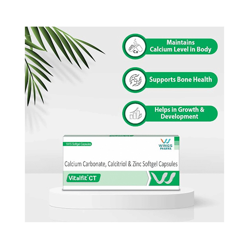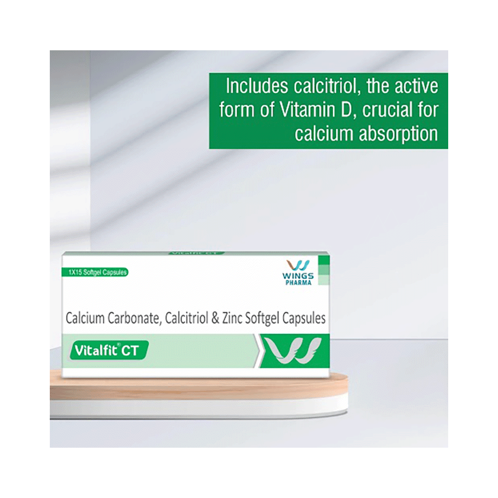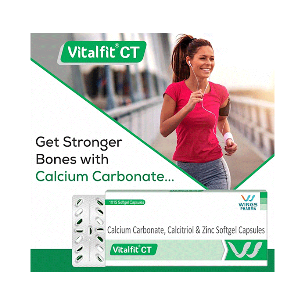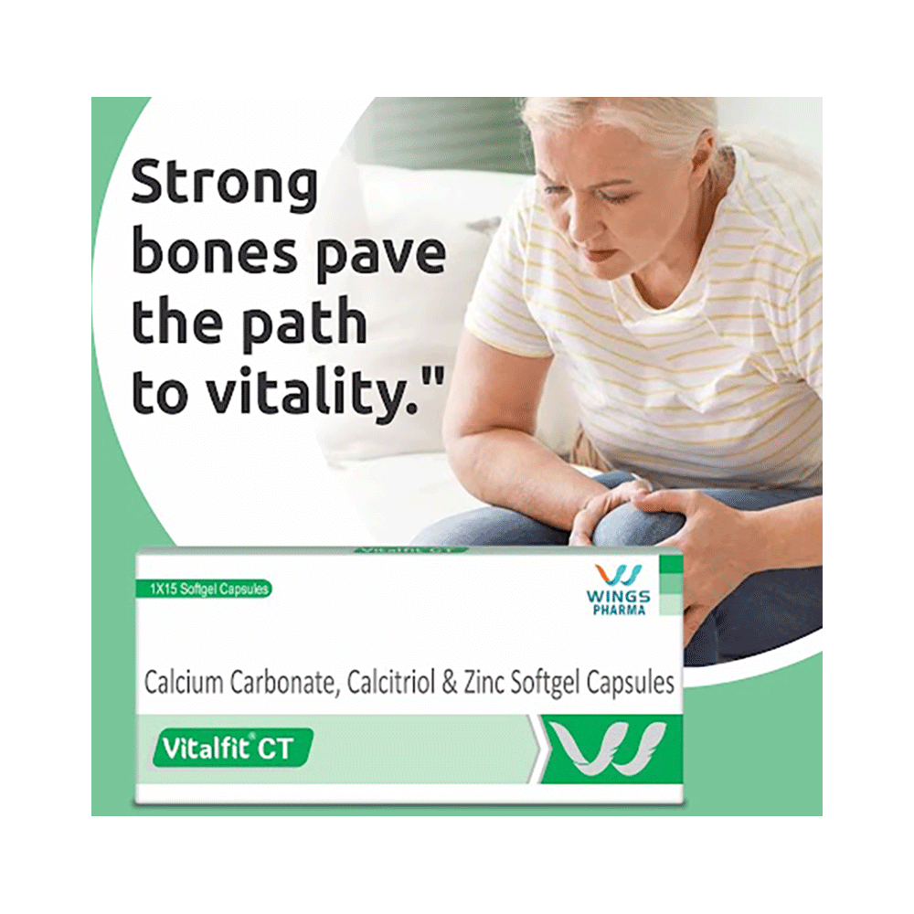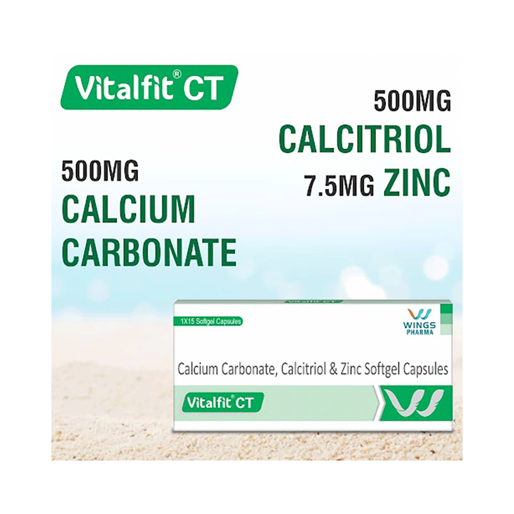 Vitalfit CT Softgel Capsule is a combination of three medicines: Calcitriol, Calcium Carbonate and Zinc Sulfate which treat osteoporosis. Calcitriol helps your body effectively absorb Calcium Carbonate and additionally supports the muscles needed to avoid falls. Calcium Carbonate and Zinc Sulfate help build and maintain bones.