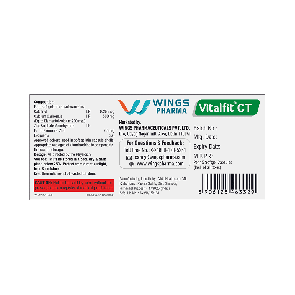 Vitalfit CT Softgel Capsule is a combination of medicines that is used to treat nutritional deficiencies. It helps in the absorption of calcium and bone strengthening. It helps in proper growth and development of bones. It also helps in protein synthesis and the production of blood cells (red and white blood cells). Vitalfit CT Softgel Capsule may be taken with or without food. It should be used in the dose and duration as prescribed by your doctor. It is advised to take this medicine at a fixed time.This medicine should not be taken more than the recommended dose. It is usually a safe medicine with very minimal or no side effects. However, if you experience severe diarrhea, vomiting, or constipation, you should consult your doctor without delay.Before taking this medicine, tell your doctor if you have any other health conditions. Inform your doctor if you are taking any other medicines or if you are pregnant or breastfeeding. It is advised not to take alcohol after taking this medicine.