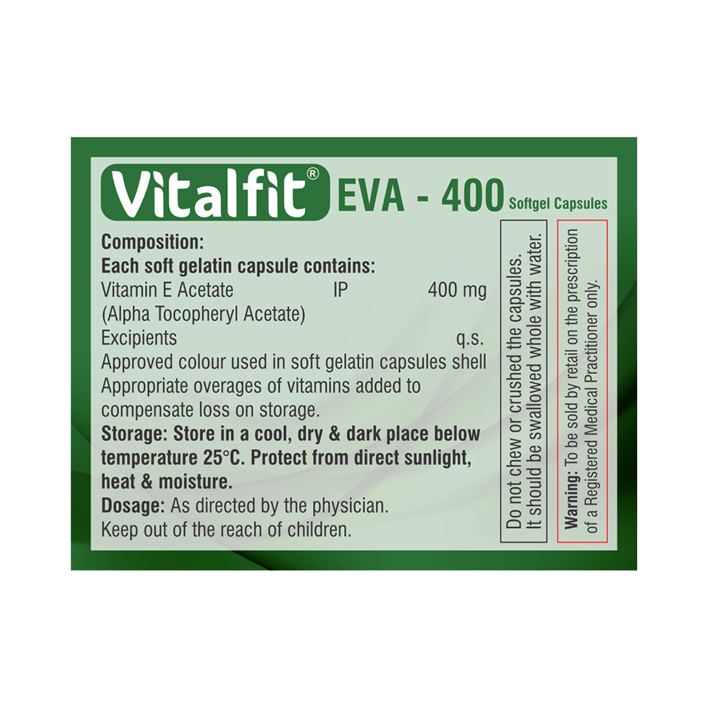 In Treatment of Vitamin E deficiencyVitalfit EVA 400 Soft Gelatin Capsule contains Vitamin E that has antioxidant properties that prevent any damage due to free radicals produced by toxins in our body. It improves the functioning of the immune system, skin health and also prevents any harmful effects of ultraviolet rays of the sun.