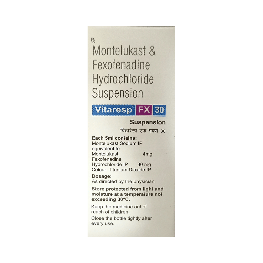 Vitaresp FX 30 Oral Suspension Mango is a combination medicine used in the treatment of allergy symptoms such as runny nose, stuffy nose, sneezing, watery eyes, and congestion or stuffiness. Vitaresp FX 30 Oral Suspension Mango is taken with or without food in a dose and duration as advised by the doctor. The dose you are given will depend on your condition and how you respond to the medicine. You should keep taking this medicine for as long as your doctor recommends. If you stop treatment too early your symptoms may come back and your condition may worsen. Let your healthcare team know about all other medications you are taking as some may affect, or be affected by this medicine.The most common side effects include nausea, diarrhea, vomiting, skin rash, flu-like symptoms, and headache. Most of these are temporary and usually resolve with time. Contact your doctor straight away if you are at all concerned about any of these side effects. This medicine may cause dizziness and sleepiness, so do not drive or do anything that requires mental focus until you know how this medicine affects you. Avoid drinking alcohol while taking this medicine as it can worsen your sleepiness.Never support self-medication or recommend your medicine to another person. It is beneficial to have plenty of fluids while taking this medication. Before you start taking this medicine it is important to inform your doctor if you are suffering from liver or kidney disease. You should also tell your doctor if you are pregnant, planning pregnancy or breastfeeding.