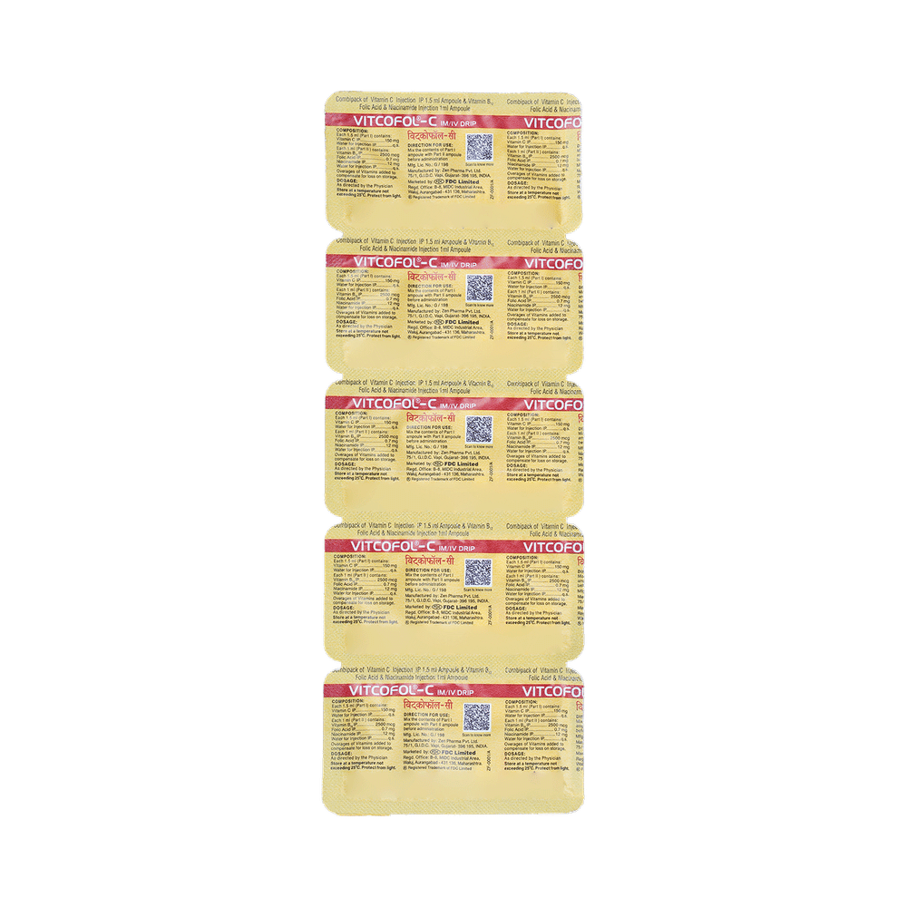 Vitcofol-C Combipack Injection is a combination of four nutritional supplements: Folic Acid, Methylcobalamin, Niacinamide and Vitamin C, which replenishes the body's stores of important nutrients.
