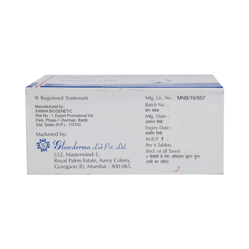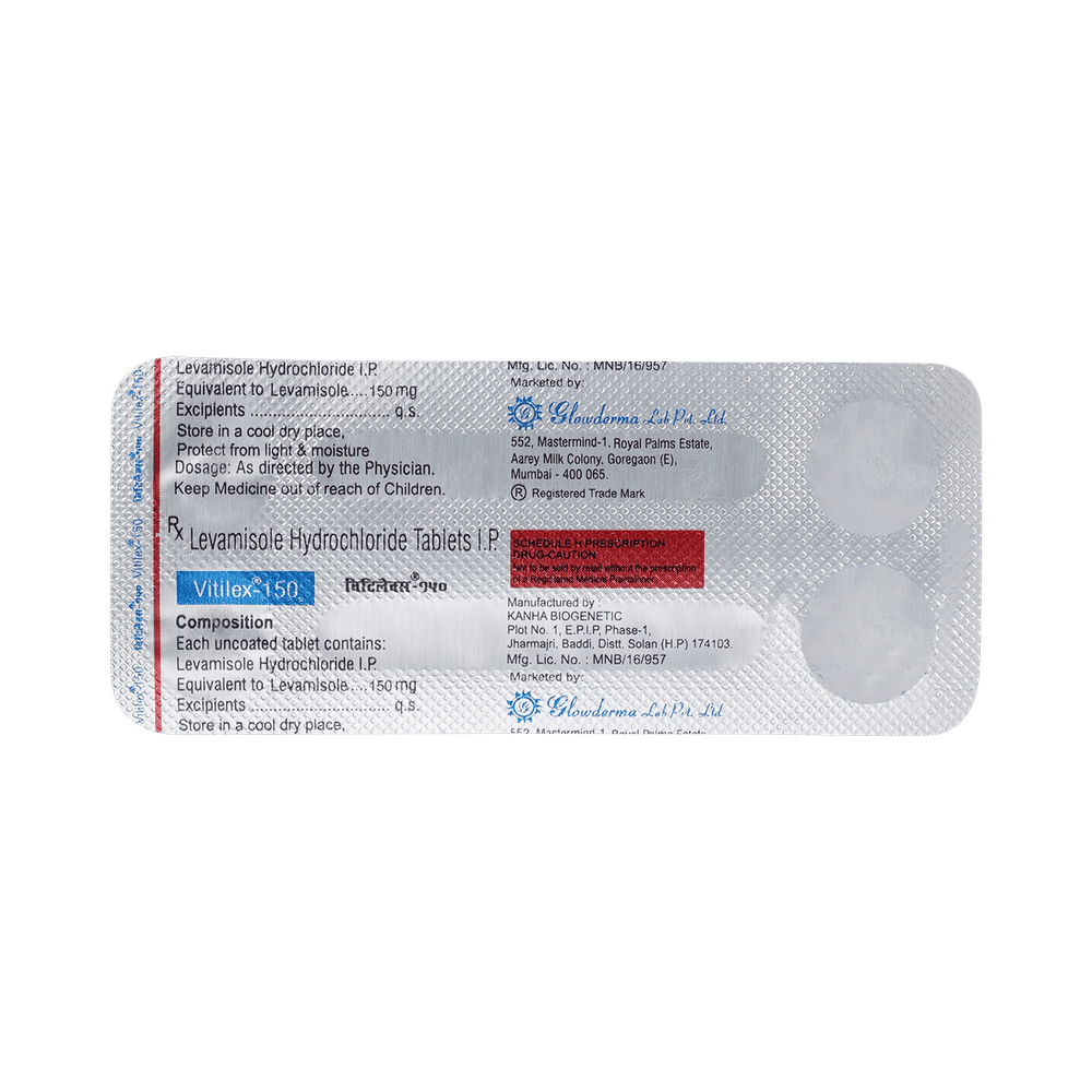 Vitilex 150mg Tablet is an antiparasitic medication. It is used in the treatment of worm infections. It works by killing the worms and this treats your infection. Vitilex 150mg Tablet should be used in the dose and duration as advised by your doctor. It should be taken with food, preferably at a fixed time. Avoid skipping any doses and finish the full course of treatment even if you feel better. Do not take a double dose to make up for a missed dose. Simply take the next dose as planned.There is limited data available regarding common side effects of Vitilex 150mg Tablet. However, some people may experience symptoms such as vomiting, headache, dizziness, nausea, and stomach pain as the side effects of this medicine. Consult your doctor if these side effects do not resolve or persist for a longer duration. You may be monitored with blood tests and liver function tests throughout your treatment.