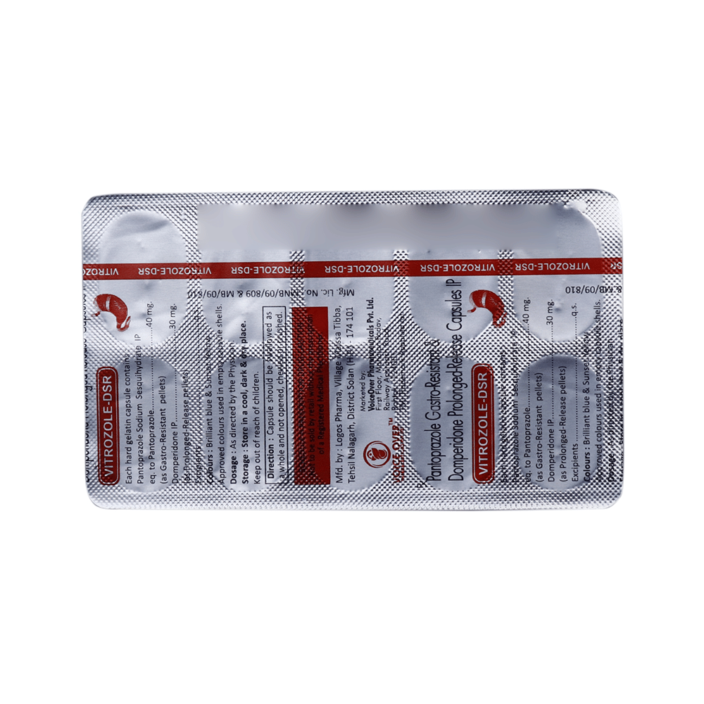 Vitrozole-DSR Capsule is a medicine that is used to treat conditions like acid reflux disease (GERD), erosive esophagitis, gastritis, gastric and duodenal ulcers, and indigestion with symptoms like heartburn, bloating, and regurgitation. It works by lowering acid production and helping the stomach empty faster. Take Vitrozole-DSR Capsule exactly as prescribed by your doctor, usually once daily before breakfast. Swallow it whole with water; do not crush or chew. To get the best results, maintain a healthy diet, avoid late-night meals, caffeine, spicy or oily foods, and stop smoking or alcohol use. Do not skip doses or stop early, even if you feel better, as that may lead to a return of the symptoms.The most common side effect of Vitrozole-DSR Capsule is dry mouth. It may also cause headache, dizziness, diarrhea, nausea, or mild stomach discomfort in some people. These are usually temporary. If you experience persistent vomiting, irregular heartbeat, rash, or severe diarrhea, contact your doctor immediately. Staying hydrated and taking the medicine before meals may help reduce stomach-related side effects.Inform your doctor about any liver, kidney, or heart problems before starting Vitrozole-DSR Capsule. Avoid taking it with other drugs that may affect heart rhythm or interact with domperidone or pantoprazole. Do not use it if you have a history of gastrointestinal bleeding or obstruction, or if you are allergic to any of the ingredients in the medicine. Pregnant or breastfeeding women should consult their doctor before use.