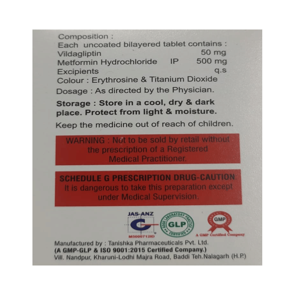 Salt Composition: Metformin (500mg) + Vildagliptin (50mg)