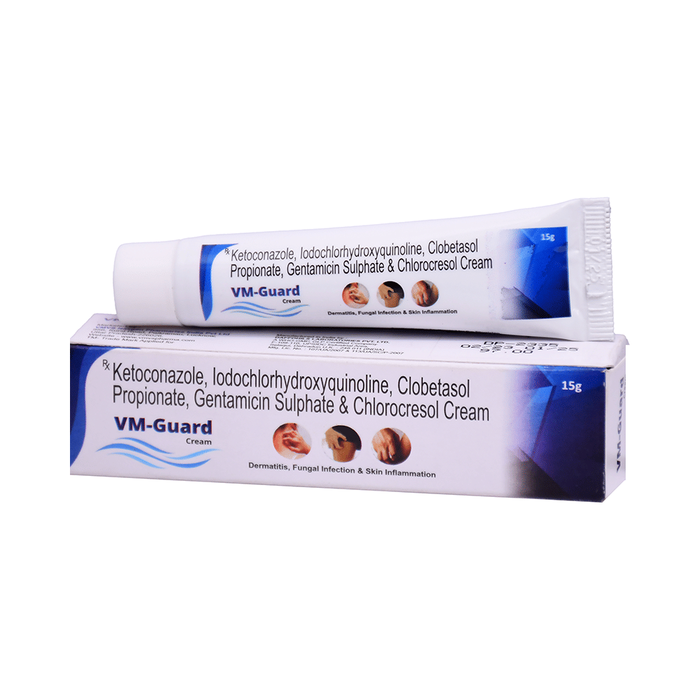 VM-Guard Cream is a combination of medicines used to treat dermatitis, fungal infections, and other skin conditions with inflammation and itching. It kills the microorganisms that cause the infection and stops their multiplications. It also helps reduce inflammation, redness, swelling, and itching. VM-Guard Cream is for external use only. However, use it in the dose and duration prescribed by your doctor. Do not use it in more than the recommended amount as that can increase its absorption and cause side effects. Wash your hands thoroughly before and after applying this medicine. In case of accidental contact with the eyes, mouth, or nose, rinse these areas with cold water.This medicine is generally safe to use with no common side effects. However, if you experience any unusual side effects from applying this medicine, let your doctor know. They may be able to help by changing the medicine or reducing its dose.It is unlikely that other medicines you take by mouth or injection will affect the way VM-Guard Cream works, but inform your doctor in case you are taking any other medicines. Pregnant and breastfeeding women should also consult their doctors before using this medicine.