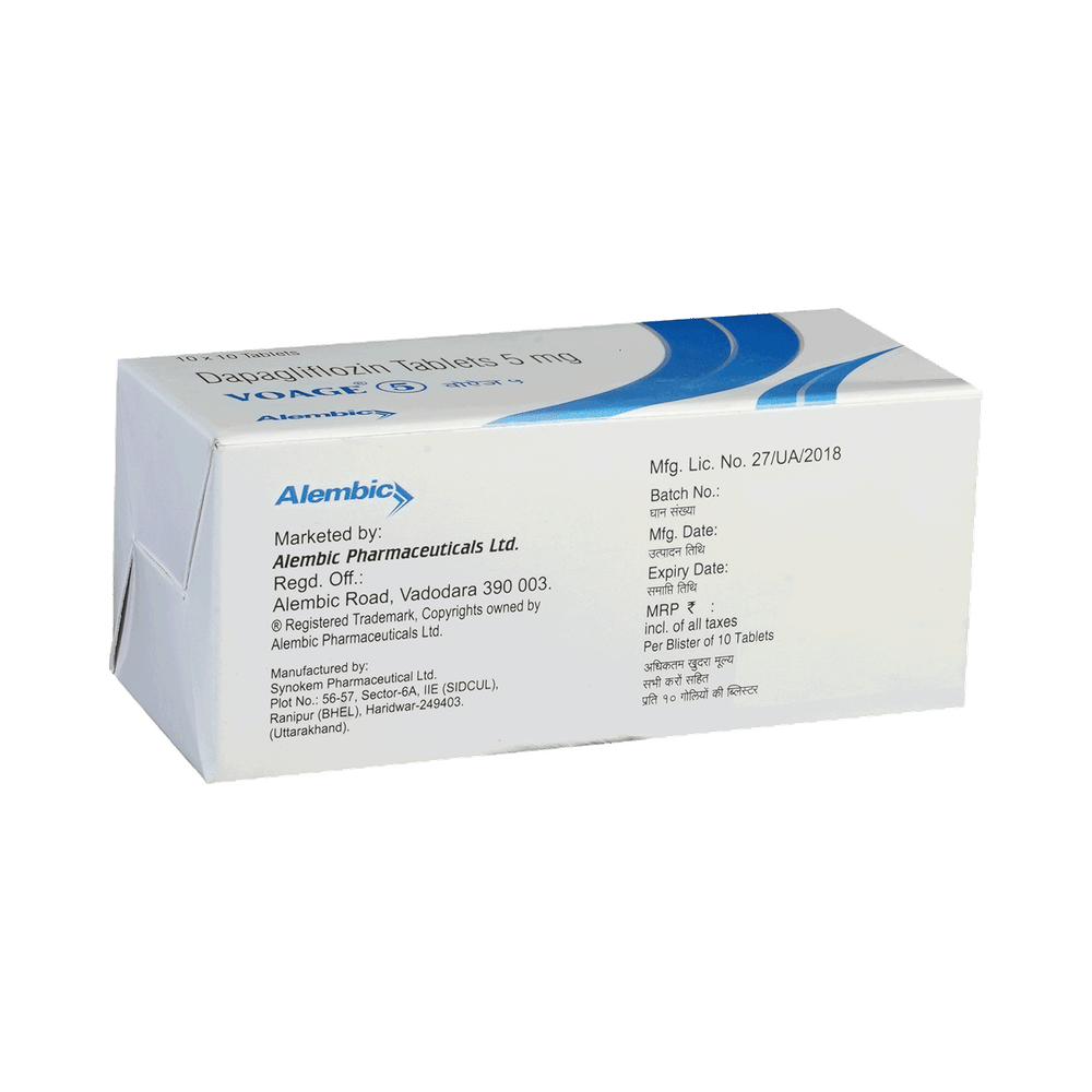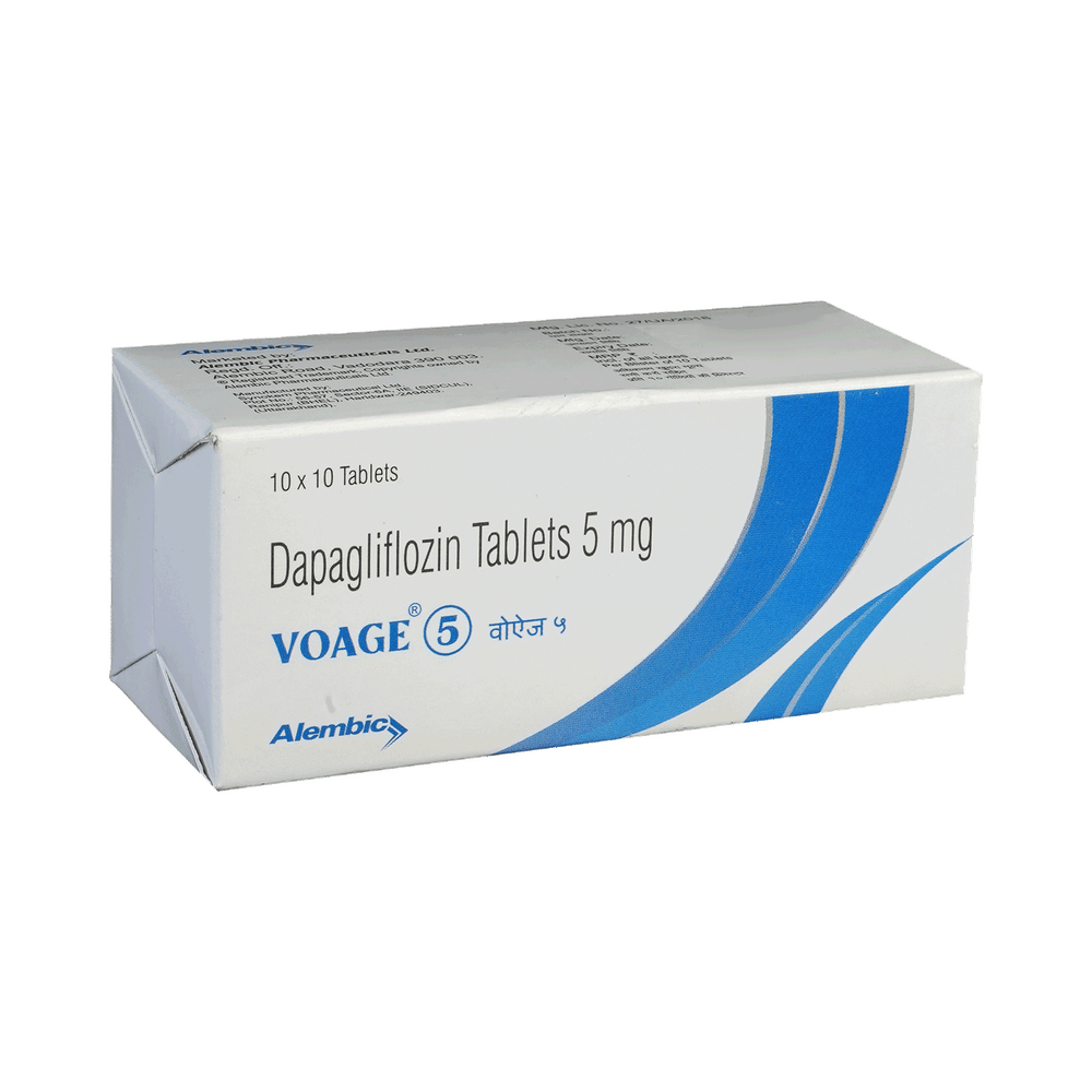 Voage 5 Tablet is used alone or in combination with other medicines to treat type 2 diabetes mellitus. It helps control the high blood sugar levels seen in diabetes. This reduces the chances of serious complications of diabetes and also helps prevent heart disease. Voage 5 Tablet can be taken with or without food at any time of day, but you should try to take it at the same time every day. The dose will be decided by your doctor. Do not stop taking it without asking your doctor. If you do, your blood sugar levels may increase and put you at risk of serious complications like kidney damage and blindness. This medicine is only part of a treatment program that should include a healthy diet, regular exercise, and weight reduction as advised by your doctor.The most common side effects of Voage 5 Tablet include nausea, fungal infection of the vagina, nasopharyngitis (inflammation of the throat and nasal passages), and urinary tract infections. It may cause the body to lose too much water. Drink plenty of fluids to prevent dehydration. Maintaining good hygiene can help prevent the development of fungal infections in the genital area.Before taking this medicine, inform your doctor if you have any kidney or liver problems or a urinary tract infection, or if you are on water pills (diuretics). Pregnant or breastfeeding women should also consult their doctor before taking it. Avoid excessive alcohol intake while taking it, as this may increase the risk of developing some side effects. Monitor your blood sugar levels regularly while taking this medicine.