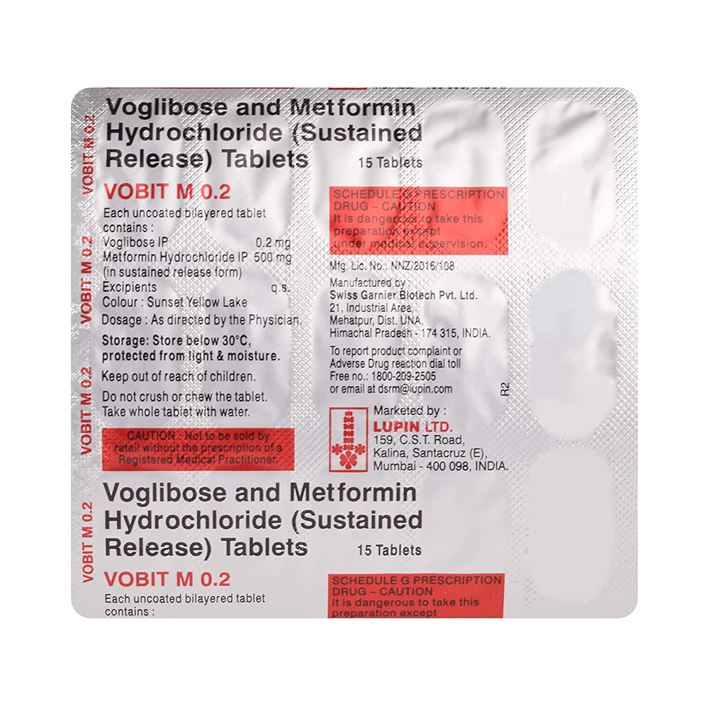 Vobit M 0.2 Tablet SR belongs to a category of medicines known as anti-diabetic drugs. It is a combination of medicines used to treat type 2 diabetes mellitus in adults. It helps control blood sugar levels in people with diabetes. Vobit M 0.2 Tablet SR should be taken with food. Take it regularly at the same time each day to get the most benefit. Your doctor will decide what dose is best for you and this may change from time to time according to how it is working according to your blood sugar levels.Keep taking this medicine, even if you feel well or your blood sugar levels are controlled. If you stop it without consulting your doctor, your blood sugar levels could rise and put you at risk of kidney damage, blindness, nerve problems and loss of limbs. Remember that it is only part of a treatment program that should also include a healthy diet, regular exercise, and weight reduction as advised by your doctor. Your lifestyle plays a big part in controlling diabetes.This medicine may cause side effects like nausea, taste change, loss of appetite, flatulence, stomach pain, diarrhea, and skin rash. However, these are temporary and usually subside on their own. If these do not resolve or worry you, please consult your doctor. Your doctor might suggest ways of dealing with your side effects or treating them if they are bothersome.You should not take it if you have type 1 diabetes mellitus, if you have diabetic ketoacidosis (high levels of acid in your blood), or if you have severe kidney or liver disease. Before taking this medicine, tell your doctor if you have ever had heart disease. It may not be suitable. Pregnant or breastfeeding women should also consult their doctor before taking it. Your blood sugar levels should be checked regularly and your doctor may also advise blood tests to monitor your blood cell counts and liver function.