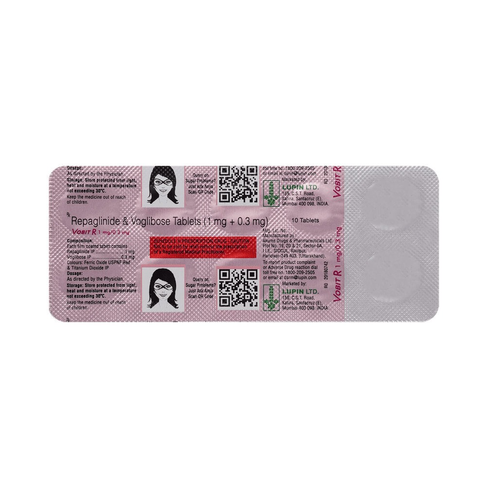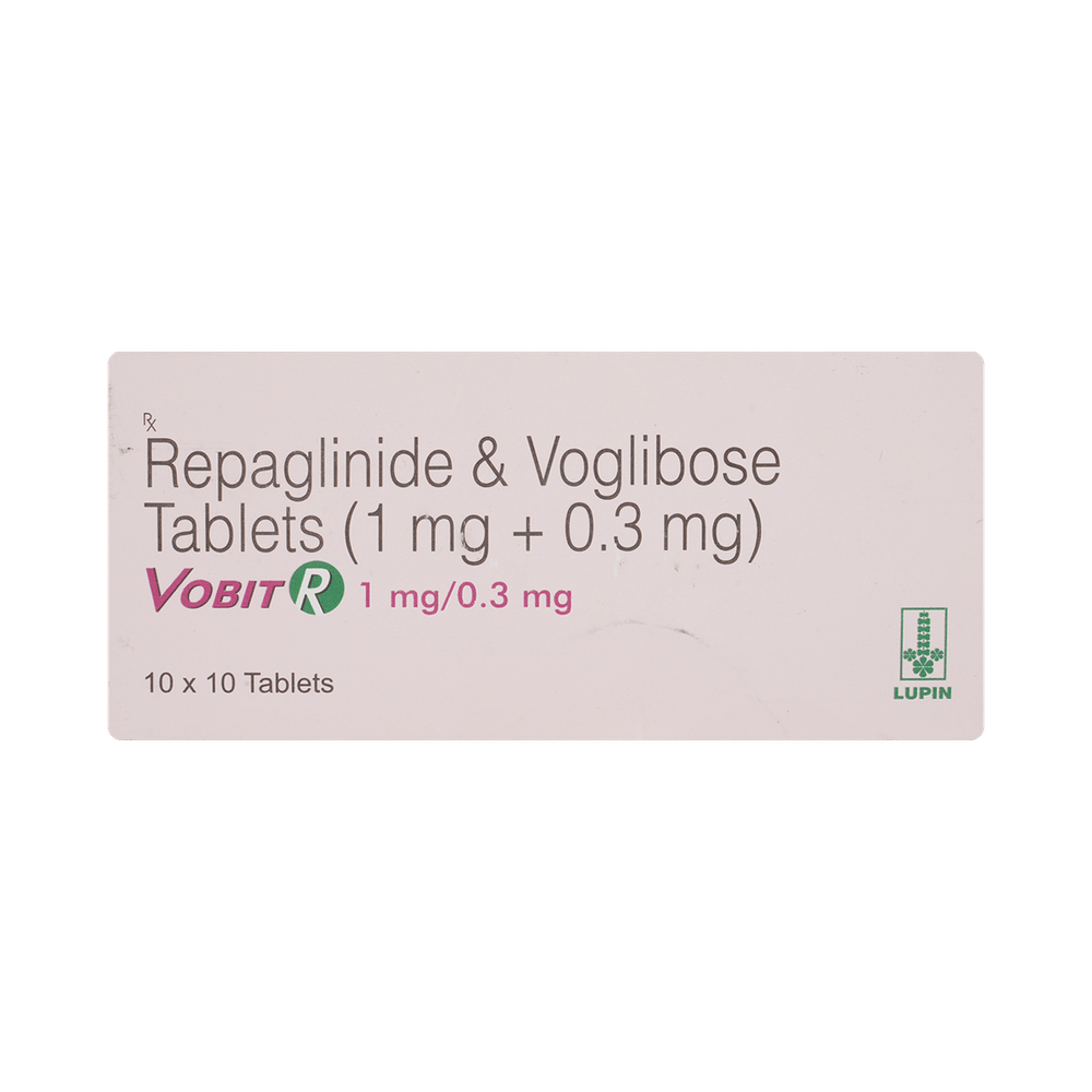Vobit R 1mg/0.3mg Tablet is a combination of two medicines used to treat type 2 diabetes mellitus. It helps control the high blood sugar levels in your body after each meal. It is used when other similar medicines along with a restricted diet, are unable to control abnormally high blood sugar levels. Vobit R 1mg/0.3mg Tablet should be taken just after meals. The dose will be decided by your doctor. Do not stop taking it without asking your doctor. If you do, your blood sugar levels may increase and put you at risk of serious complications like kidney damage and blindness. If you miss a dose, do not take the missed dose between two meals. Wait until your next meal and take it just after meals as usual. Do not take a double dose to make up for the missed dose. This medicine is only part of a treatment program that should include a healthy diet, regular exercise, and weight reduction as advised by your doctor.The most common side effects of this medicine include flatulence, diarrhea, stomach pain, hypoglycemia (low blood sugar level), and skin rash. However, these are temporary and usually resolve on their own. Please consult your doctor if these do not resolve or persist for a longer duration. Monitor your blood sugar levels regularly while taking this medicine.Before taking this medicine, inform your doctor if you have any kidney or liver problems or urinary tract infection or if you are on water pills (diuretics). Pregnant or breastfeeding women should also consult their doctor before taking it. Avoid excessive alcohol intake while taking it as this may increase the risk of developing some side effects.