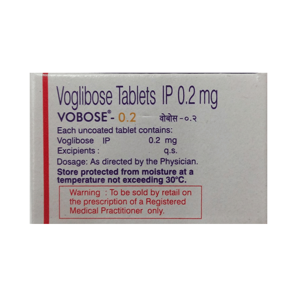 Vobose 0.2 Tablet is a medicine used to treat type 2 diabetes mellitus. It helps control the high blood sugar levels in your body after each meal. It is used when other similar medicines along with a restricted diet, are unable to control abnormally high blood sugar levels. Vobose 0.2 Tablet should be taken just before a meal. The dose and how often you need it will be decided by your doctor so that you get the right amount to control your blood sugar levels. Do not stop taking it suddenly without consulting your doctor. If you do, your blood sugar levels may increase and put you at risk of serious complications like kidney damage and blindness.This medicine is only part of a treatment program that should also include a healthy diet, regular exercise, and weight reduction as advised by your doctor. Monitor your blood sugar levels regularly while taking this medicine.The most common side effects of Vobose 0.2 Tablet include flatulence (gas), stomach pain, loss of appetite, constipation, and diarrhea. Consult your doctor if any of these side effects bother you or do not go away. This medicine by itself does not cause hypoglycemia (low blood sugar levels). However, when used in combination with other diabetes medicines (especially insulin or sulphonylureas), it can lead to hypoglycemia (low blood sugar levels). Such episodes of hypoglycemia will have to be treated by taking plain glucose. Table sugar or common sugar will not help correct low blood sugar levels if you are taking this medicine.Before taking it, let your doctor know if you have any kidney or liver problems. Do not take this medicine if you have ulceration or inflammation in the bowel (eg. ulcerative colitis or Crohn’s disease). Pregnant or breastfeeding women should also consult their doctor before taking it. Please tell your doctor about all the other medicines you are taking to make sure you are safe. Avoid excessive alcohol intake while taking this medicine as it may increase the risk of hypoglycemia (low blood sugar levels).