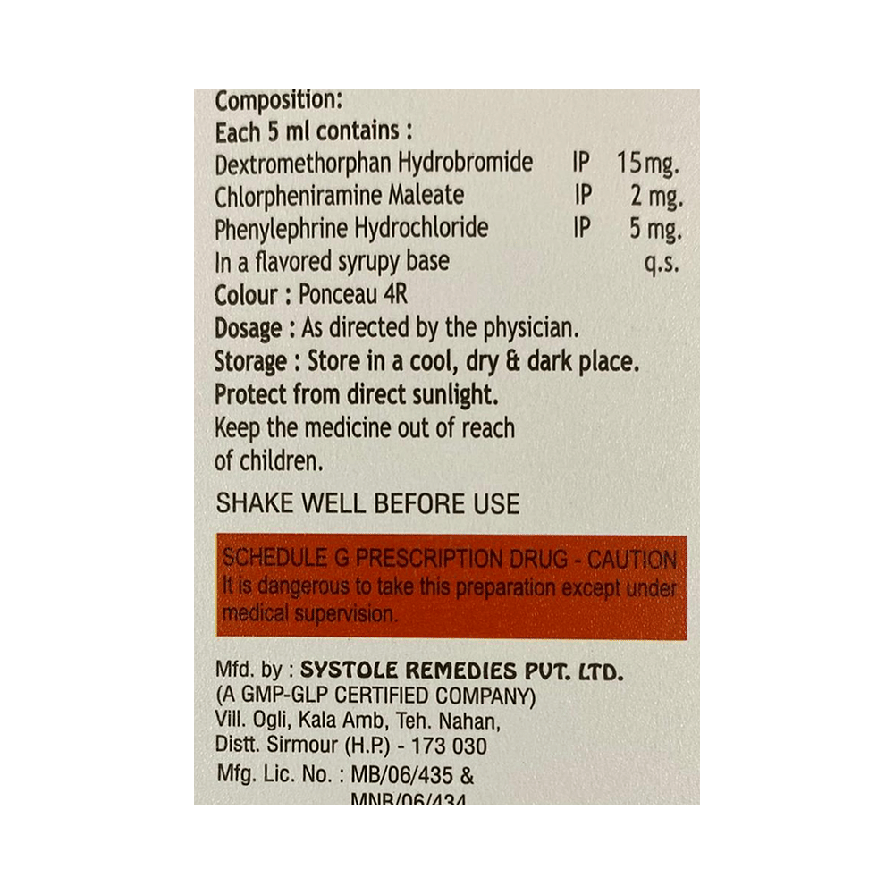 Salt Composition: Phenylephrine (5mg/5ml) + Chlorpheniramine Maleate (2mg/5ml) + Dextromethorphan Hydrobromide (15mg/5ml)