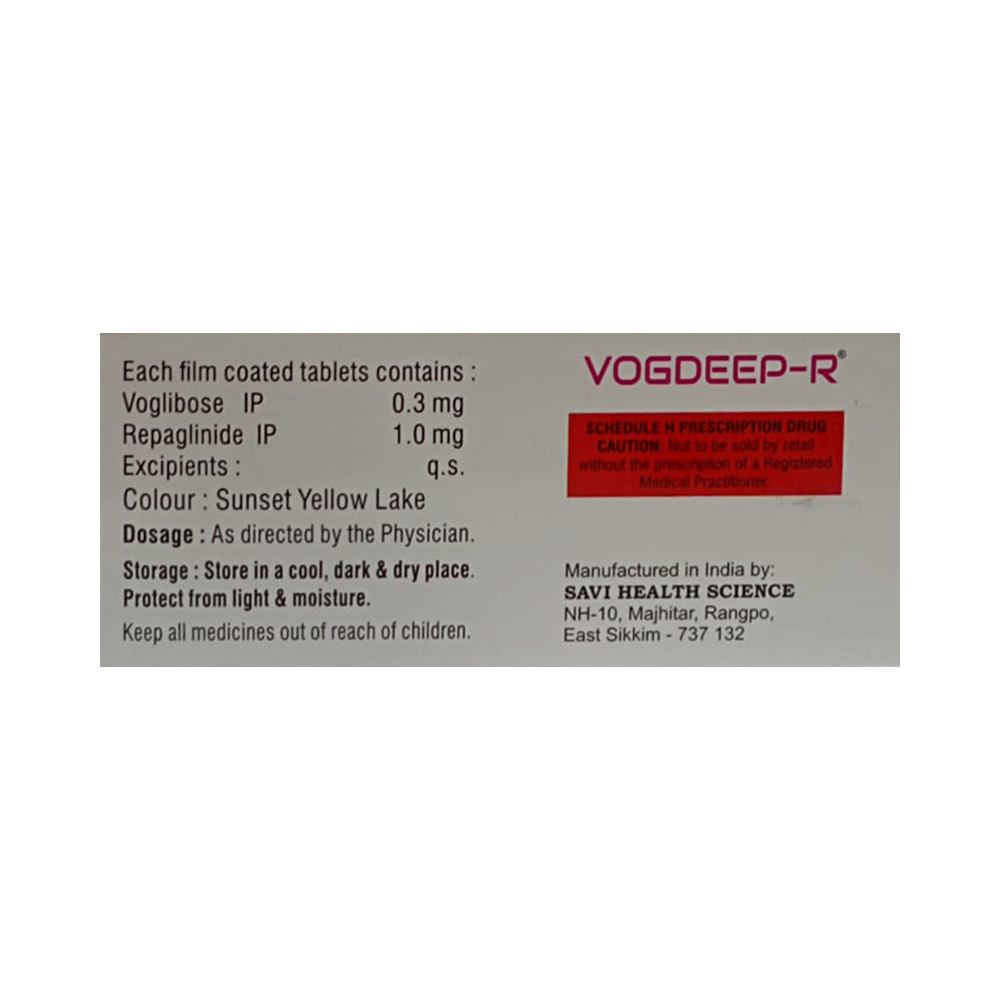 Vogdeep-R Tablet is a combination of two medicines used to treat type 2 diabetes mellitus. It helps control the high blood sugar levels in your body after each meal. It is used when other similar medicines along with a restricted diet, are unable to control abnormally high blood sugar levels. Vogdeep-R Tablet should be taken just after meals. The dose will be decided by your doctor. Do not stop taking it without asking your doctor. If you do, your blood sugar levels may increase and put you at risk of serious complications like kidney damage and blindness. If you miss a dose, do not take the missed dose between two meals. Wait until your next meal and take it just after meals as usual. Do not take a double dose to make up for the missed dose. This medicine is only part of a treatment program that should include a healthy diet, regular exercise, and weight reduction as advised by your doctor.The most common side effects of this medicine include flatulence, diarrhea, stomach pain, hypoglycemia (low blood sugar level), and skin rash. However, these are temporary and usually resolve on their own. Please consult your doctor if these do not resolve or persist for a longer duration. Monitor your blood sugar levels regularly while taking this medicine.Before taking this medicine, inform your doctor if you have any kidney or liver problems or urinary tract infection or if you are on water pills (diuretics). Pregnant or breastfeeding women should also consult their doctor before taking it. Avoid excessive alcohol intake while taking it as this may increase the risk of developing some side effects.