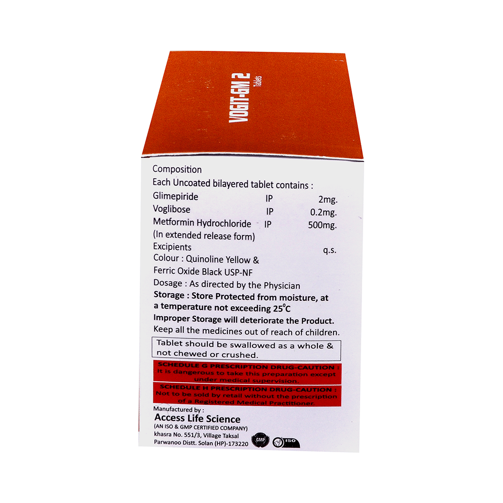 Vogit-GM 2 Tablet ER belongs to a category of medicines known as anti-diabetic drugs. It is a combination of medicines used to treat type 2 diabetes mellitus in adults. It helps control blood sugar levels in people with diabetes. Take Vogit-GM 2 Tablet ER with or immediately before meals. Take it regularly at the same time each day to get the most benefit. Your doctor will decide what dose is best for you, and this may change from time to time depending on how it is working according to your blood sugar levels.Keep taking this medicine, even if you feel well or your blood sugar levels are controlled. If you stop it without consulting your doctor, your blood sugar levels could rise and put you at risk of kidney damage, blindness, nerve problems, and loss of limbs. Remember that it is only part of a treatment program that should also include a healthy diet, regular exercise, and weight reduction as advised by your doctor. Your lifestyle plays a big part in controlling diabetes.Common side effects of Vogit-GM 2 Tablet ER are nausea, vomiting, abdominal pain, and loss of appetite. Make sure you recognize the signs of low blood glucose levels, such as sweating, dizziness, headache, and shaking, and know how to deal with them. To prevent this, it's important to have regular meals and always carry a fast-acting source of glucose, such as sugary food or fruit juice, with you.Drinking alcohol can also increase your risk of low blood sugar levels and should be avoided. Other side effects that may be seen on taking this medicine include taste changes, nausea, diarrhea, stomach pain, headache, edema (swelling), blurred vision, bone fracture, and upper respiratory tract infection. Some people may find that they put on weight with this medicine.You should not take Vogit-GM 2 Tablet ER if you have type 1 diabetes mellitus, if you have diabetic ketoacidosis (high levels of acid in your blood), or if you have severe kidney or liver disease. Before taking this medicine, tell your doctor if you have ever had heart disease, as it may not be suitable. Pregnant or breastfeeding women should also consult their doctor before taking it. Your blood sugar levels should be checked regularly, and your doctor may also advise blood tests to monitor your blood cell counts and liver function.